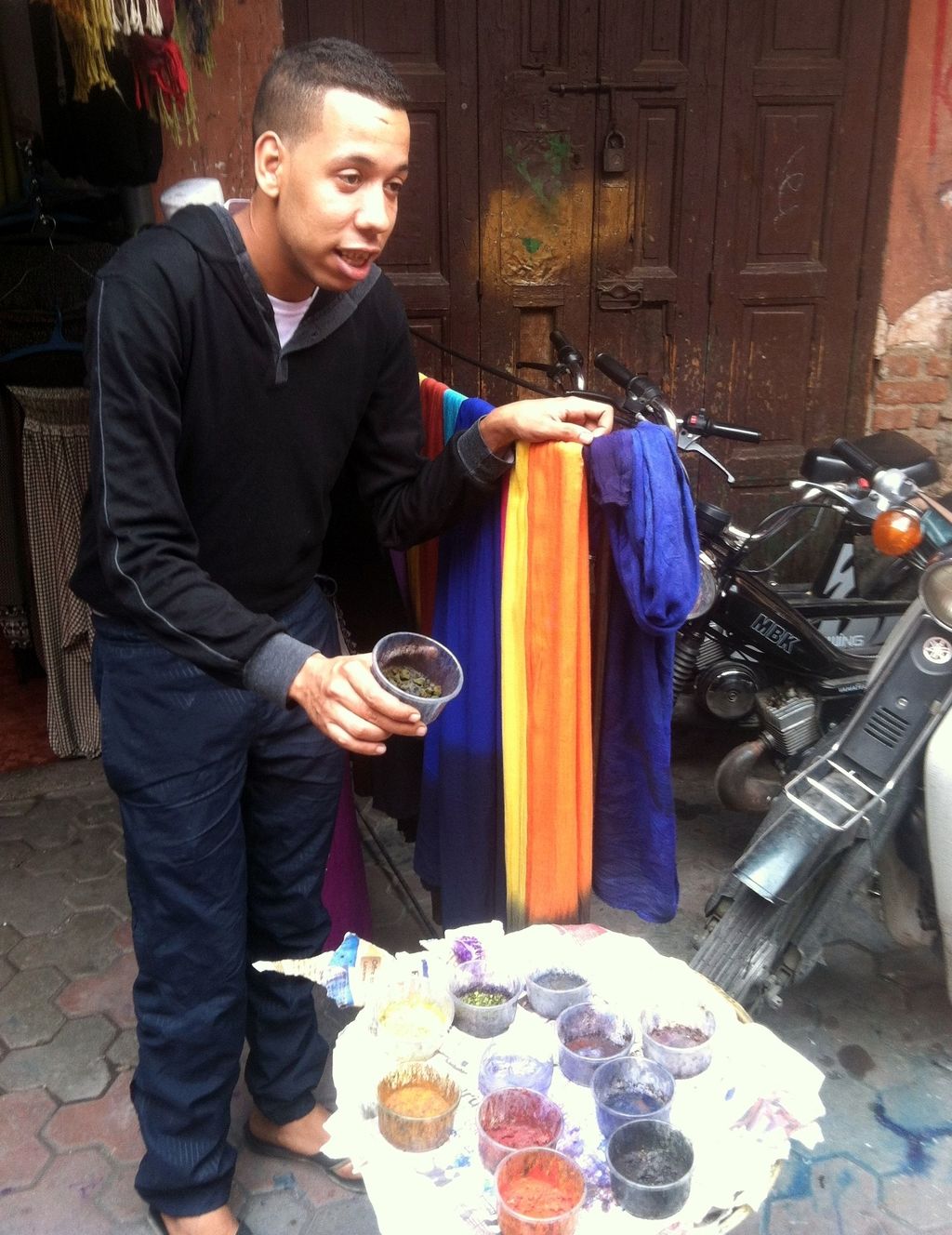 This was taken on my recent trip to Marakech, Morocco. This is the local man who hand dies the local silk to be sold in the souks of the Medina.