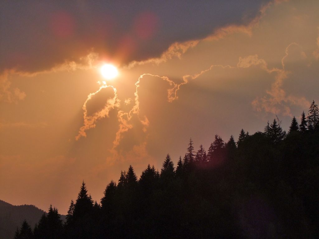 Un fantastico tramonto visto dalla diga di Bicaz, nel mezzo di migliaia di ettari di foreste, in Romania.