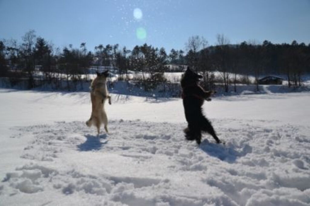 In una bellissima giornata, dove il sole riflette i suoi raggi sulla neve, due stupendi pastori belga si divertono a giocare con palline di neve..