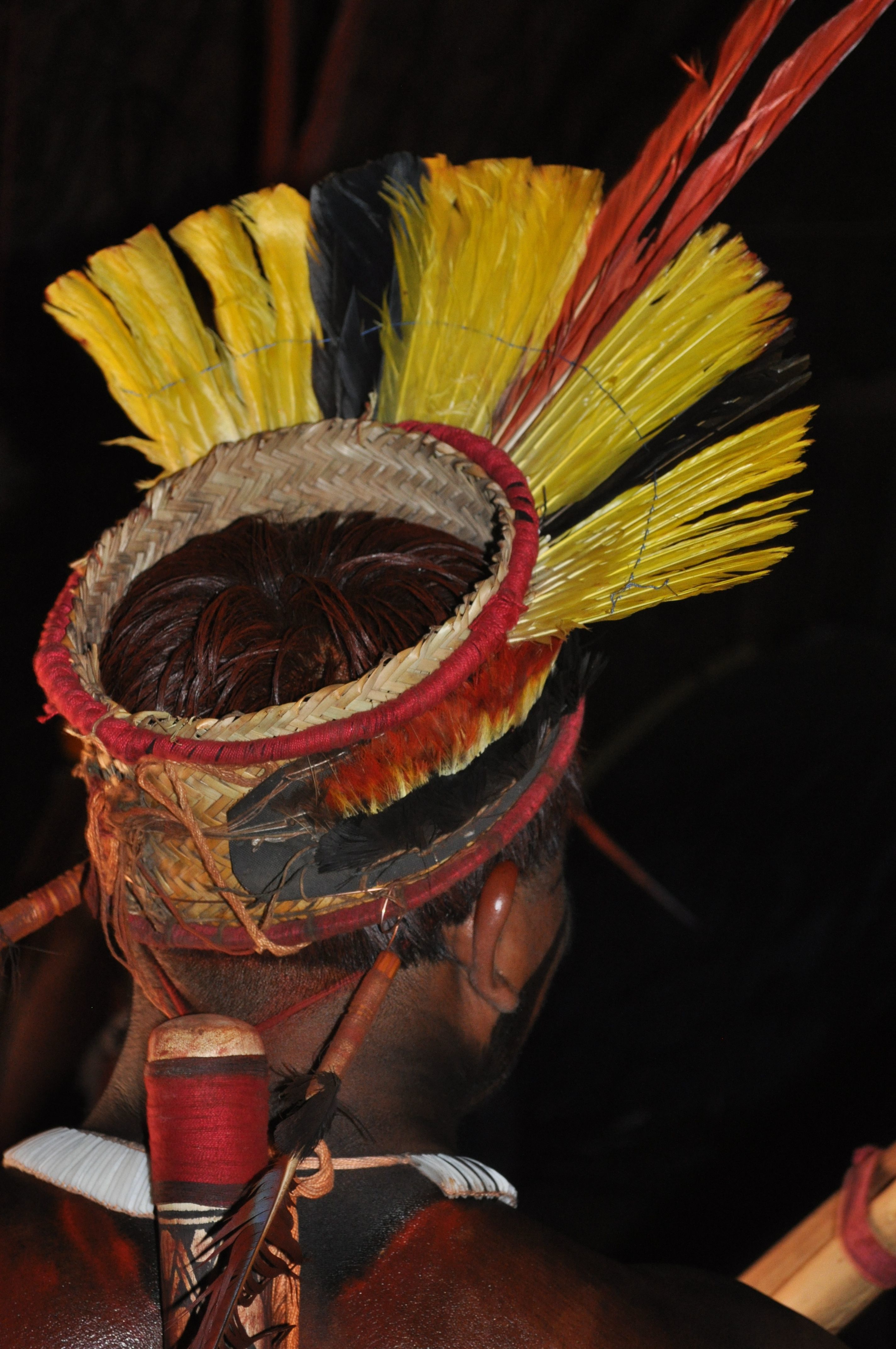 Brazilian indian from Mehinaku tribe with colourful headress used for a ceremony called Kuarup in the Xingu National Park, Mato Grosso.
