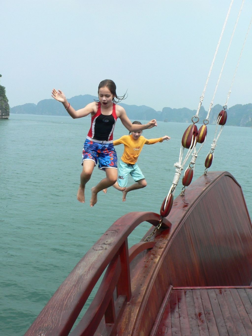 The Red Dragon is three stories high. With 9 and 12 year olds, we sailed Halong Bay for 3 superb nights. The younger brother spotted the opportunity to jump within minutes of anchoring on the first night. His older sister took another 24 hours to muster the courage. This is the moment she leapt.