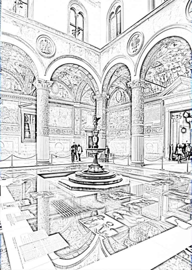 Foyer of Gallery in Florence, Italy, edited in photoshop to create a pen and ink image