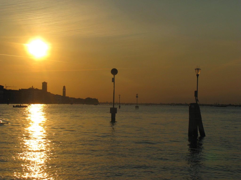 Water Taxi ride from Lido to Venice at sunset. Fascinating how the traffic lanes are marked throughout the maze of waterways that at first glance seem very random.