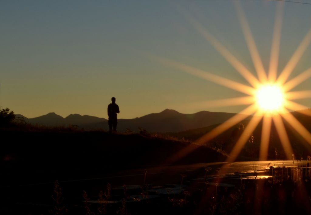 In cammino al sorgere del sole, Alto di San Roque, Camino de Santiago, Spagna.