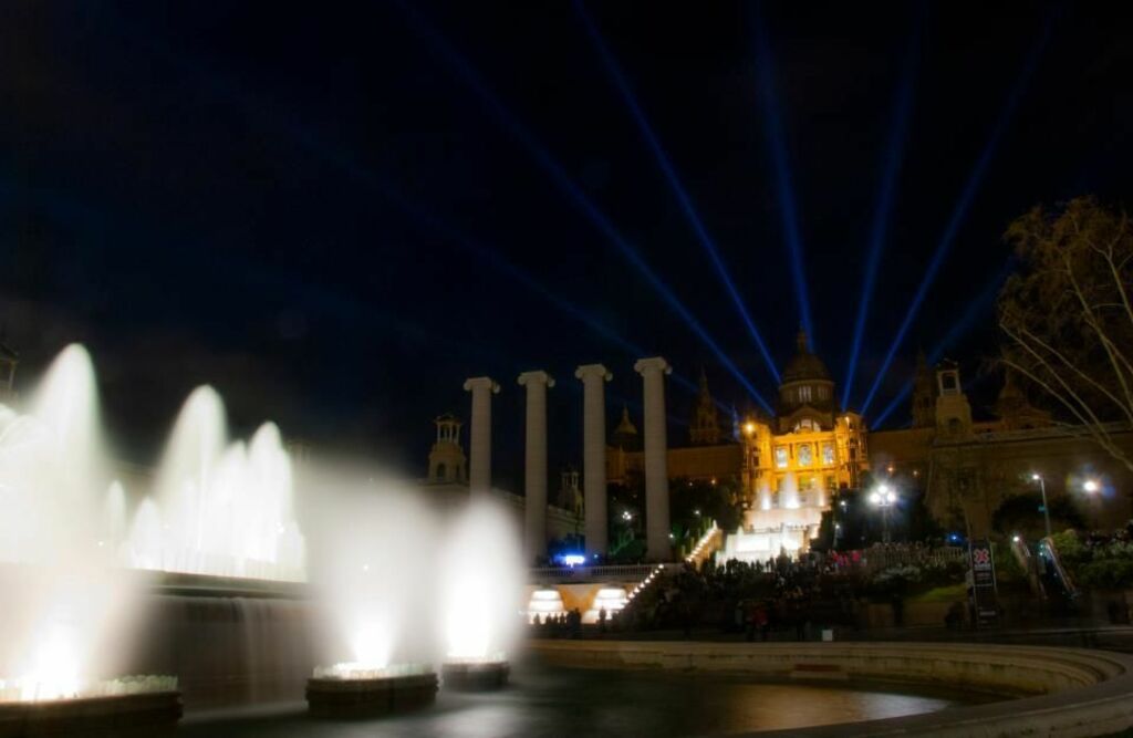 vista panoramica dal basso delle fontane danzanti di Montjuic in Spagna