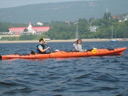 Kayak with the whales in Tadoussac, Quebec for a truly once in a lifetime experience. In the Estuary of the St. Lawrence River you might see Blue, Fin, Mink and Beluga whales. Tadoussac is a special village located on the Sagueney river near the fjords. Background: Hotel Tadoussac.