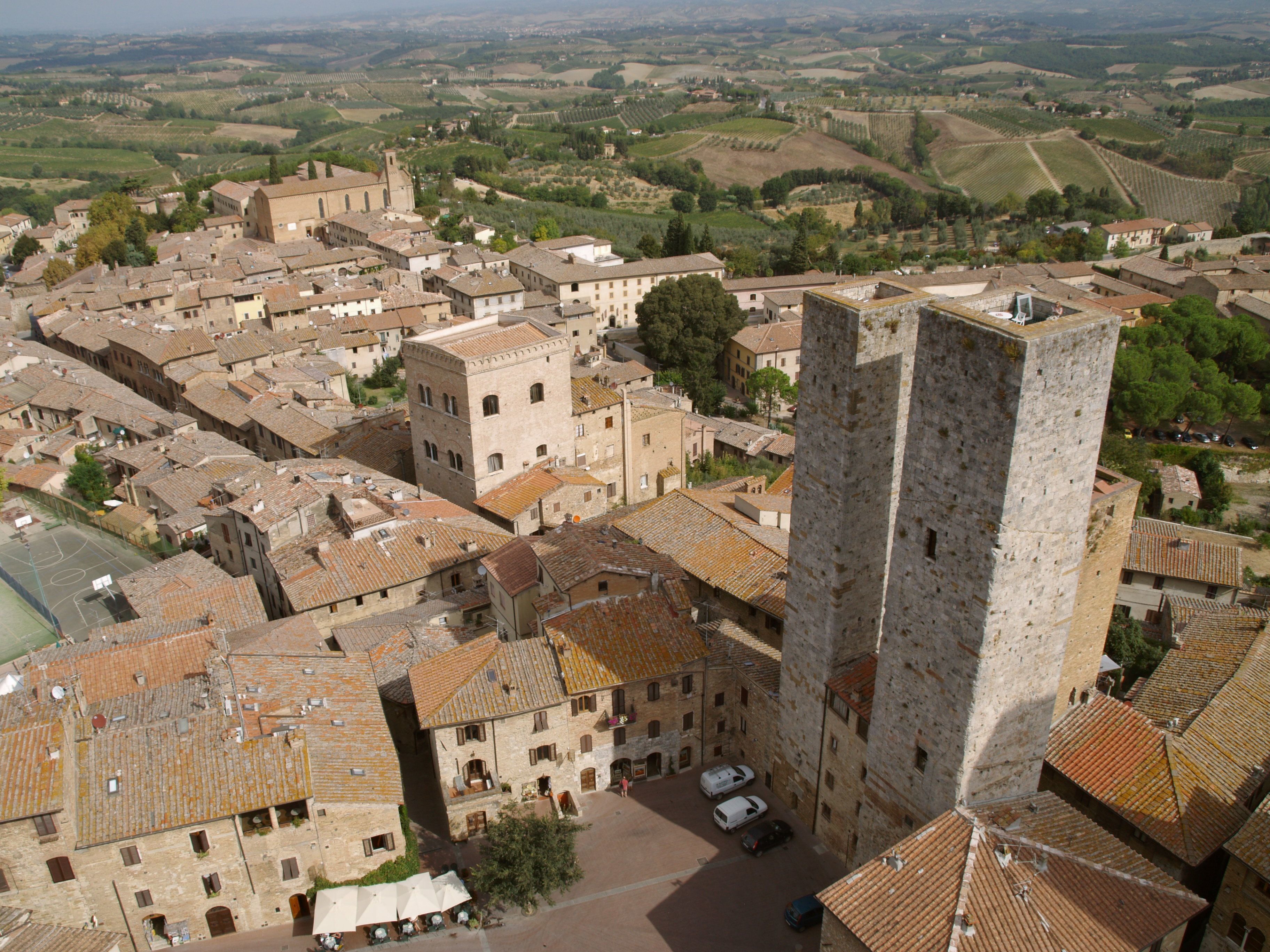We stayed in the second-tallest and only habitable tower in beautiful San Gimignano, Tuscany, on honeymoon. Ten flights of stairs, a room on each level, and stunning panoramic views from the roof terrace. Breathtaking in every sense. Photo shows me sitting at the top, taken from the town hall tower.