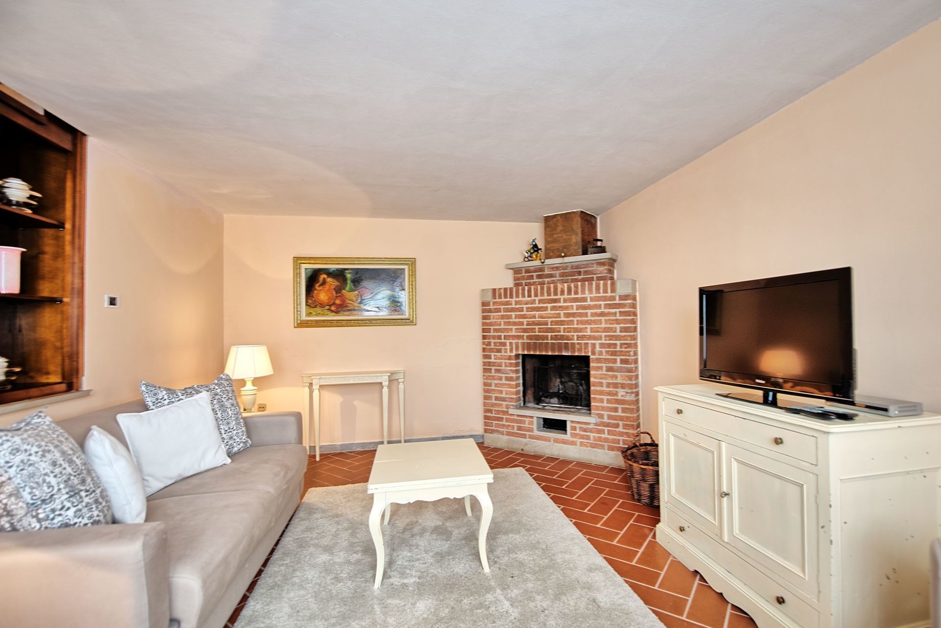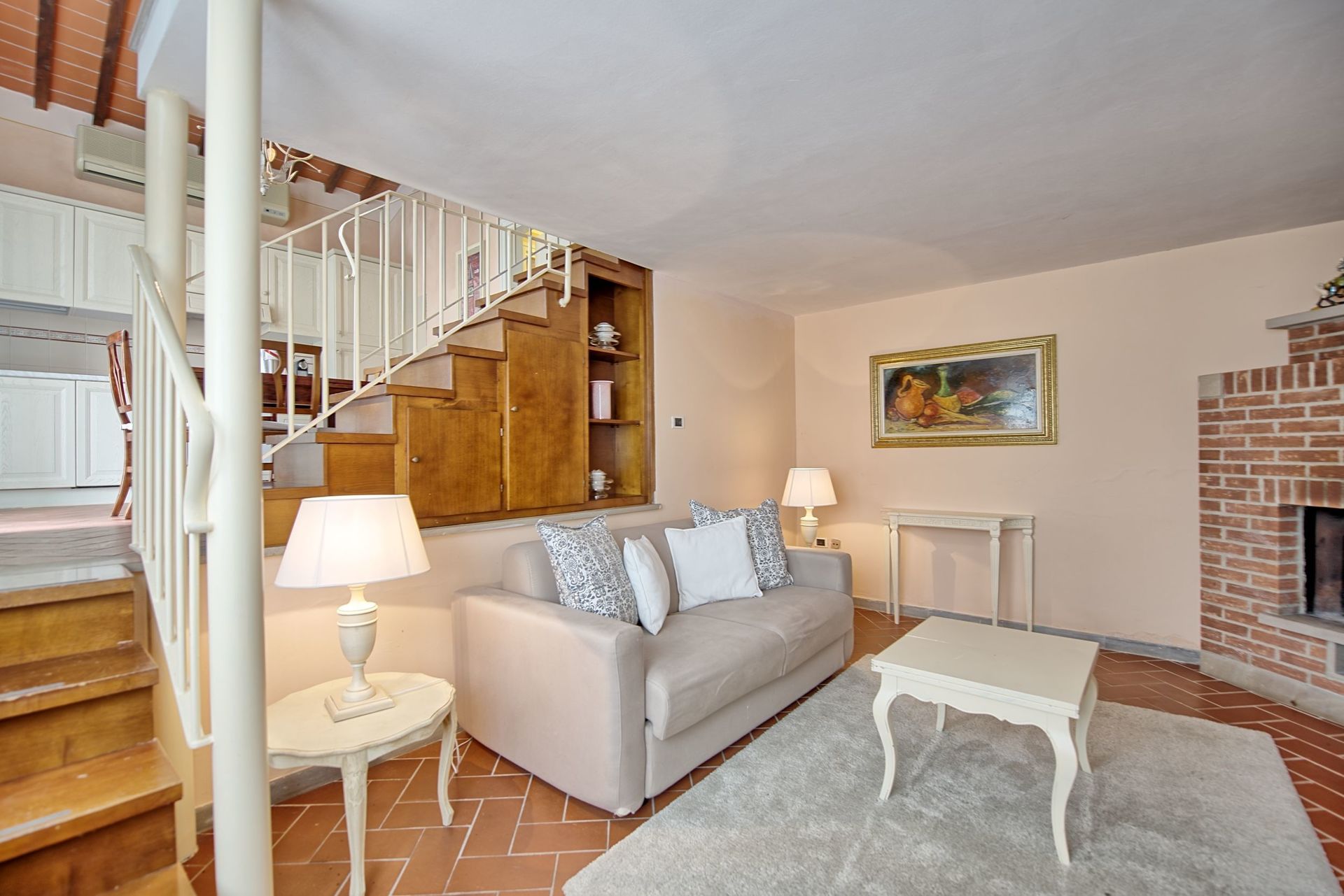 5 steps below: living room with fireplace and sofa bed (double size).