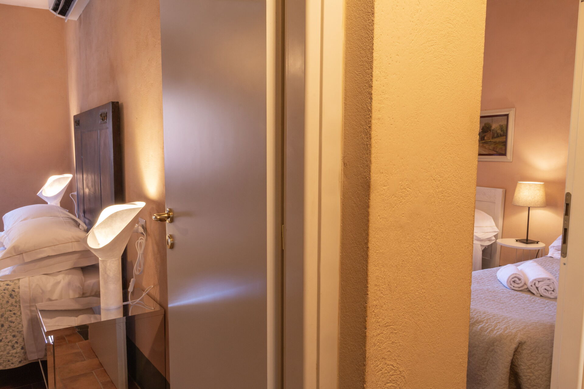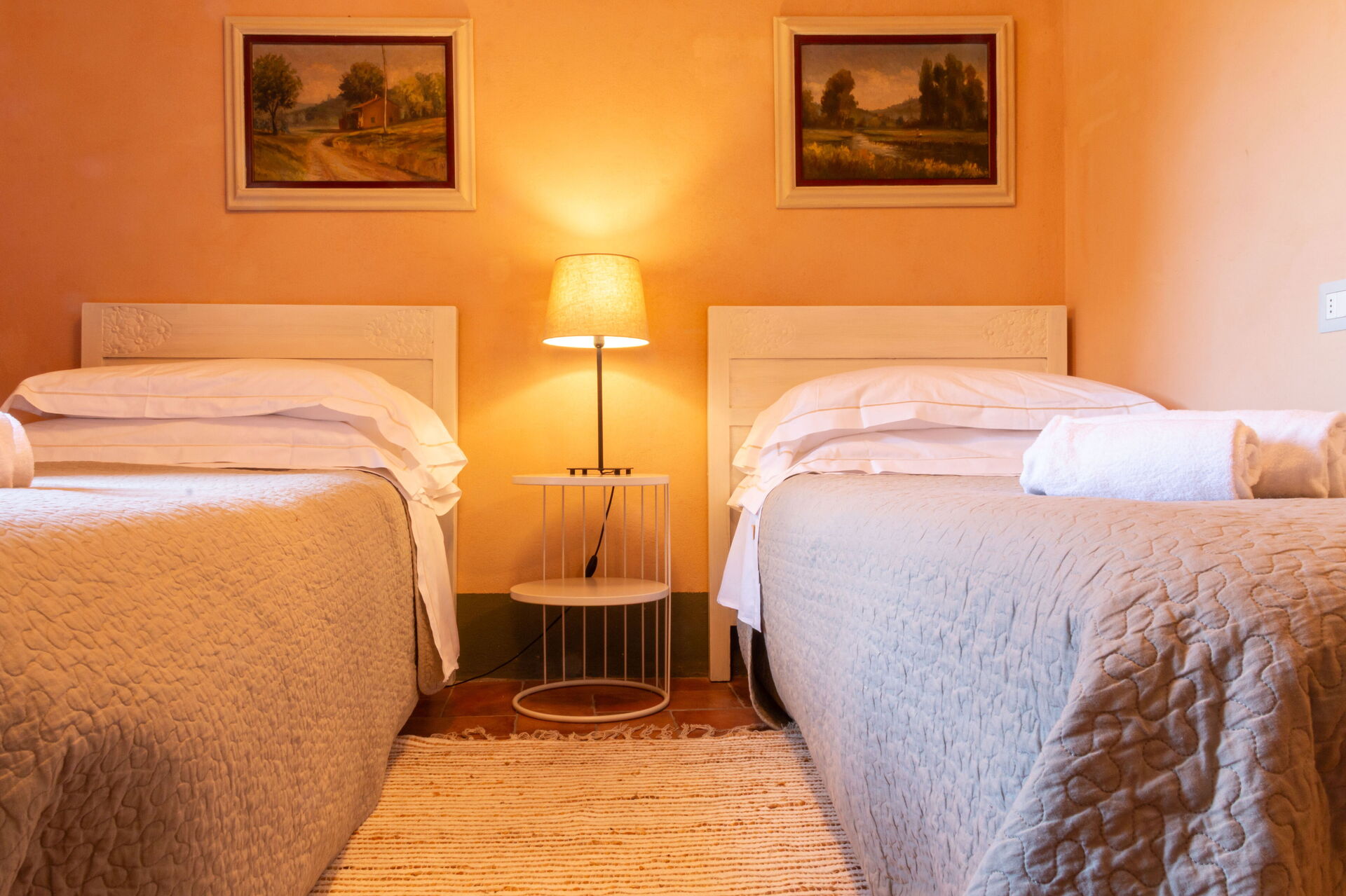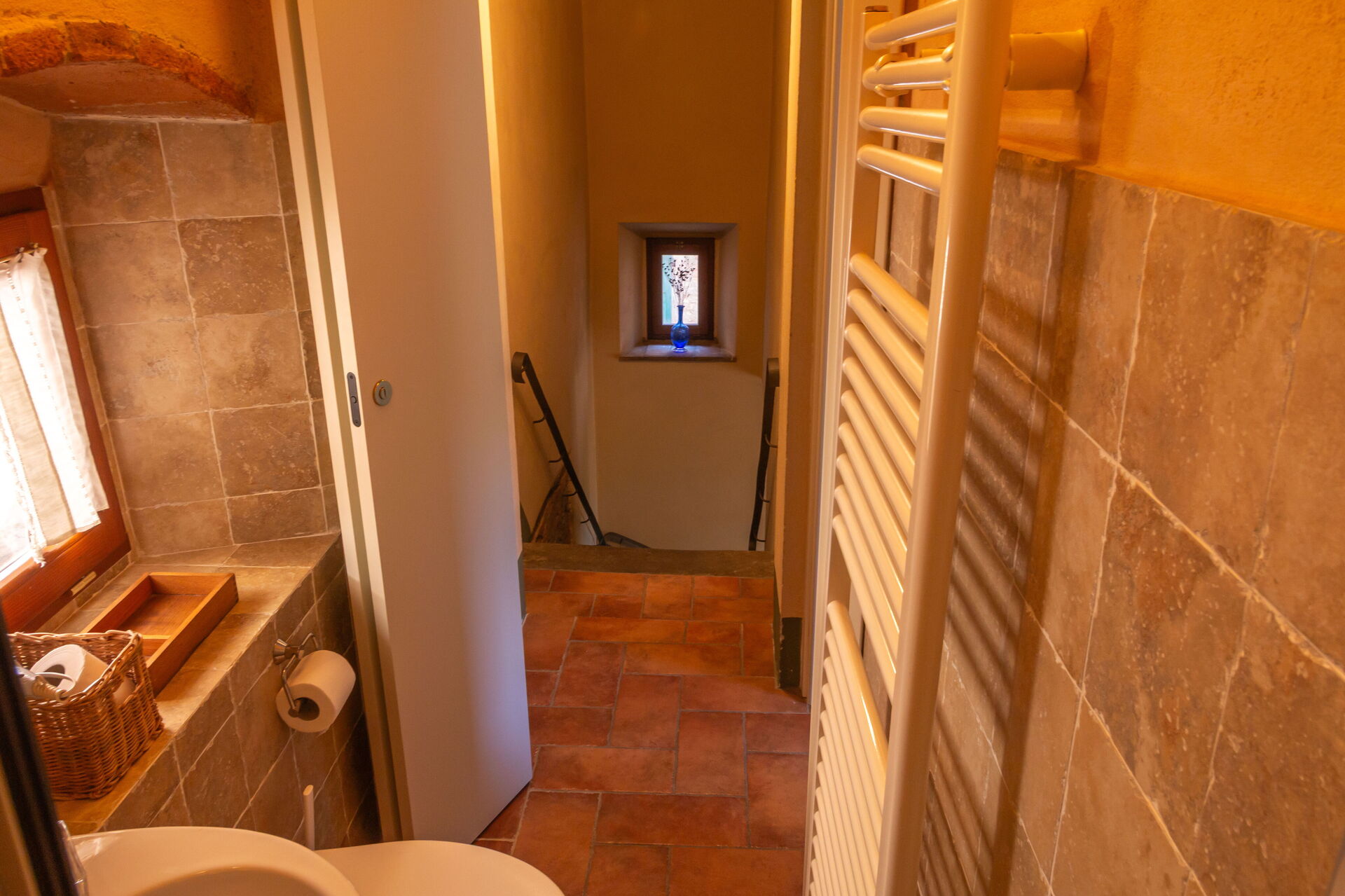 Opposite the main entrance an old stone staircase takes you to the second floor with two separate rooms, a double bedroom and a bedroom with 2 single beds.