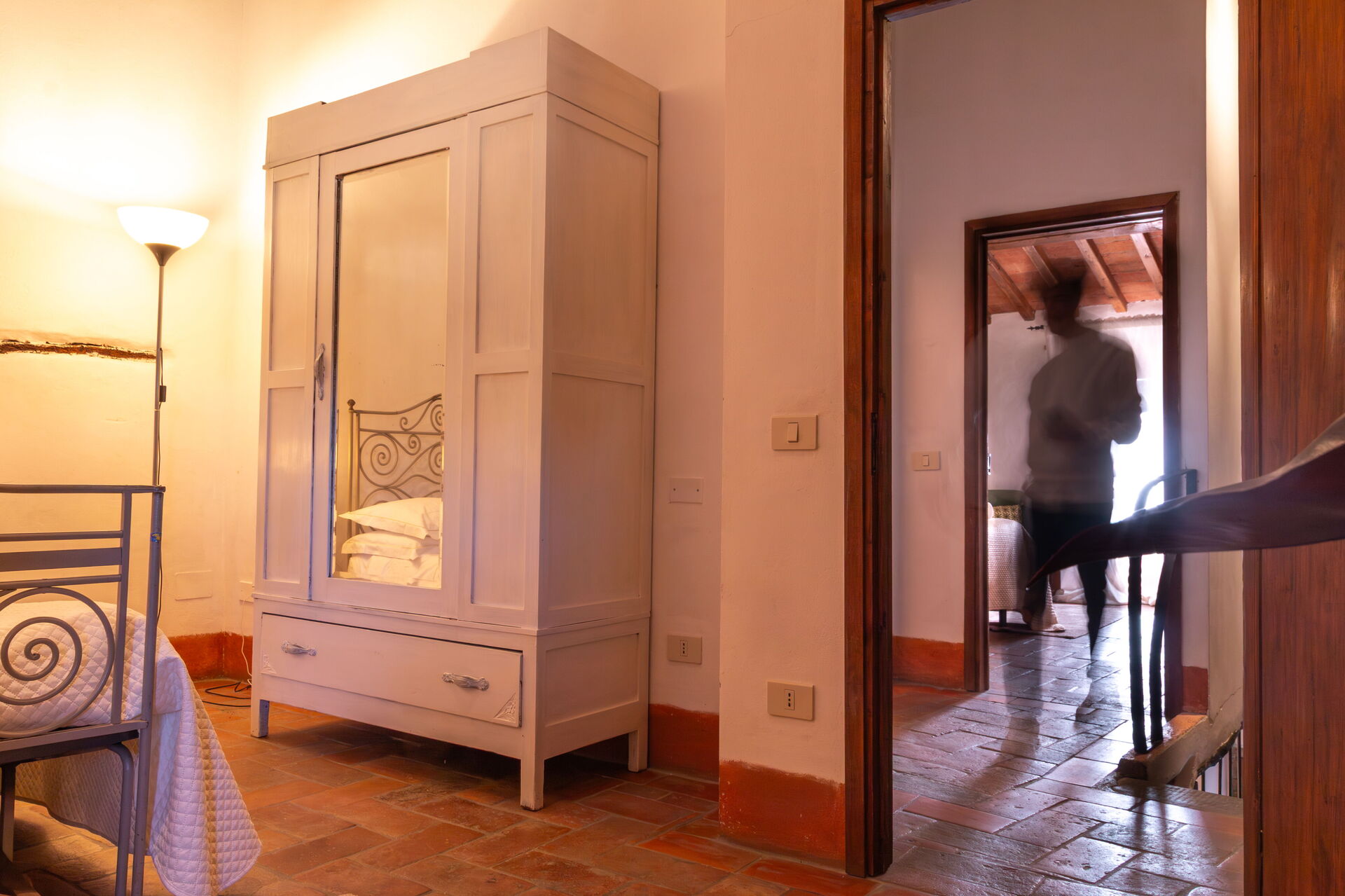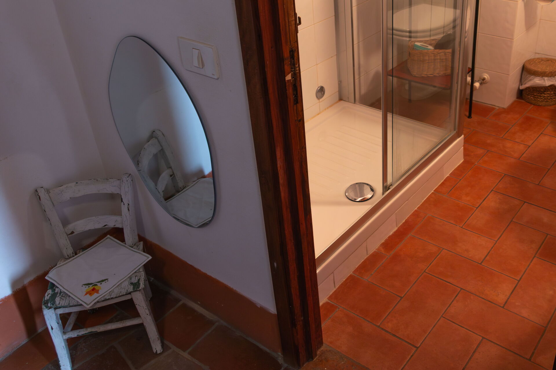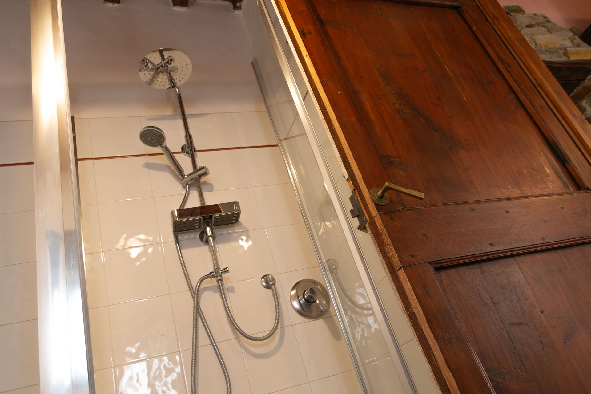 Going back to the entrance, a stone staircase leads to the second floor with two bedrooms (a double and two single beds) and a bathroom with shower. Even if the house was built to keep the ambiance very cool also during the hottest summer days, both rooms are air conditioned.