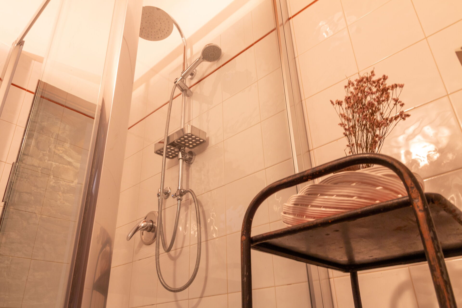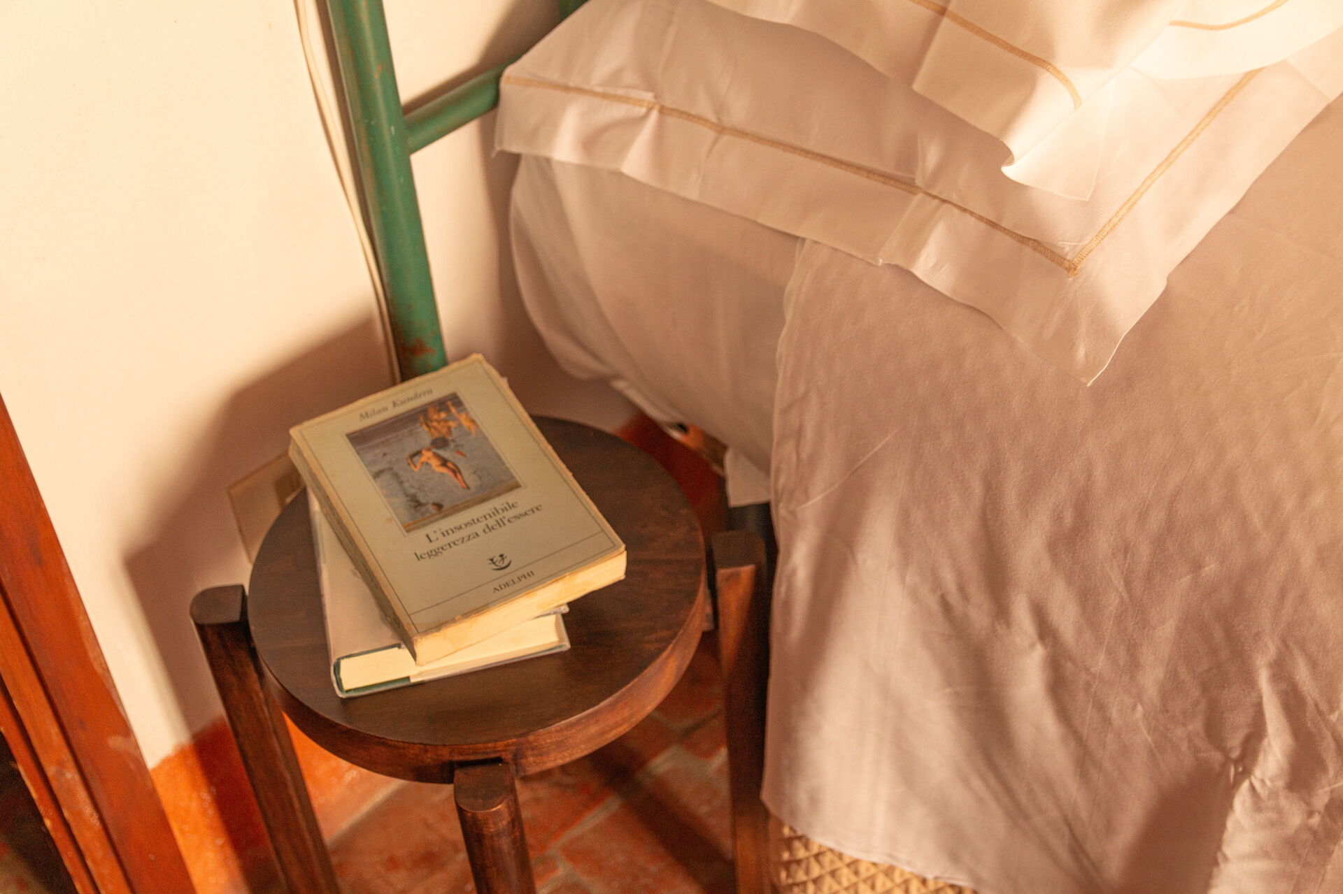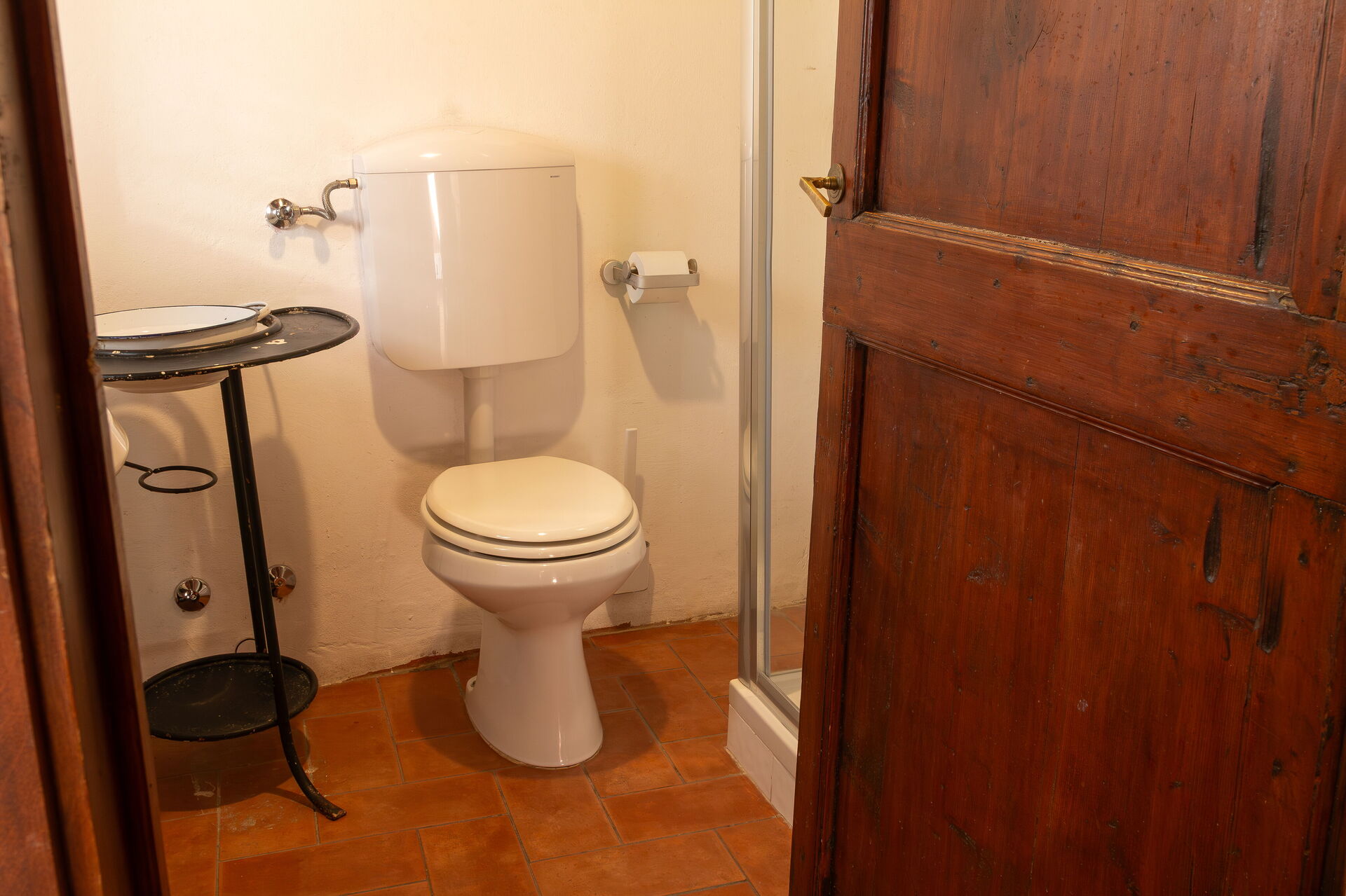 Going back to the entrance, a stone staircase leads to the second floor with two bedrooms (a double and two single beds) and a bathroom with shower. Even if the house was built to keep the ambiance very cool also during the hottest summer days, both rooms are air conditioned.