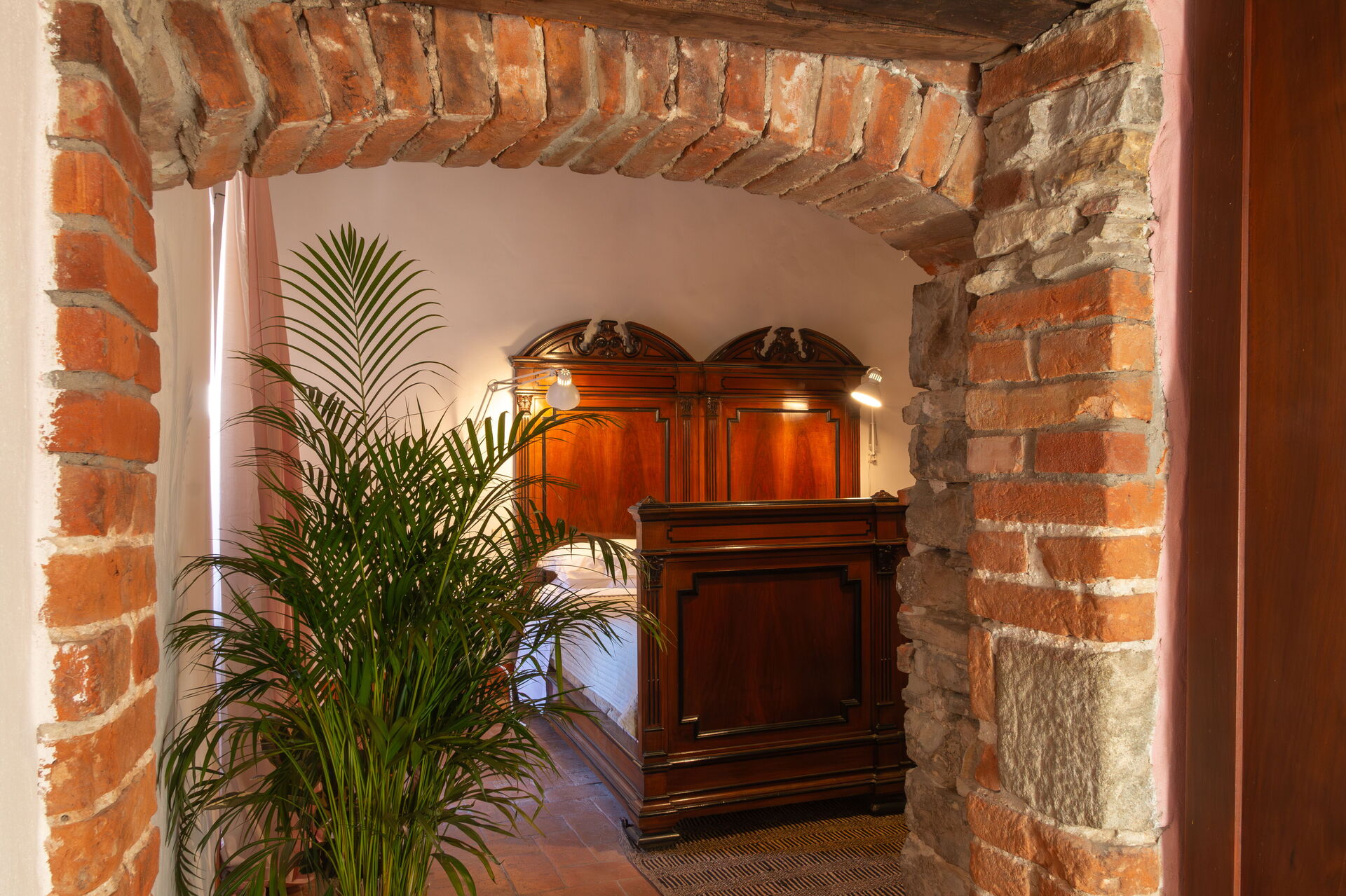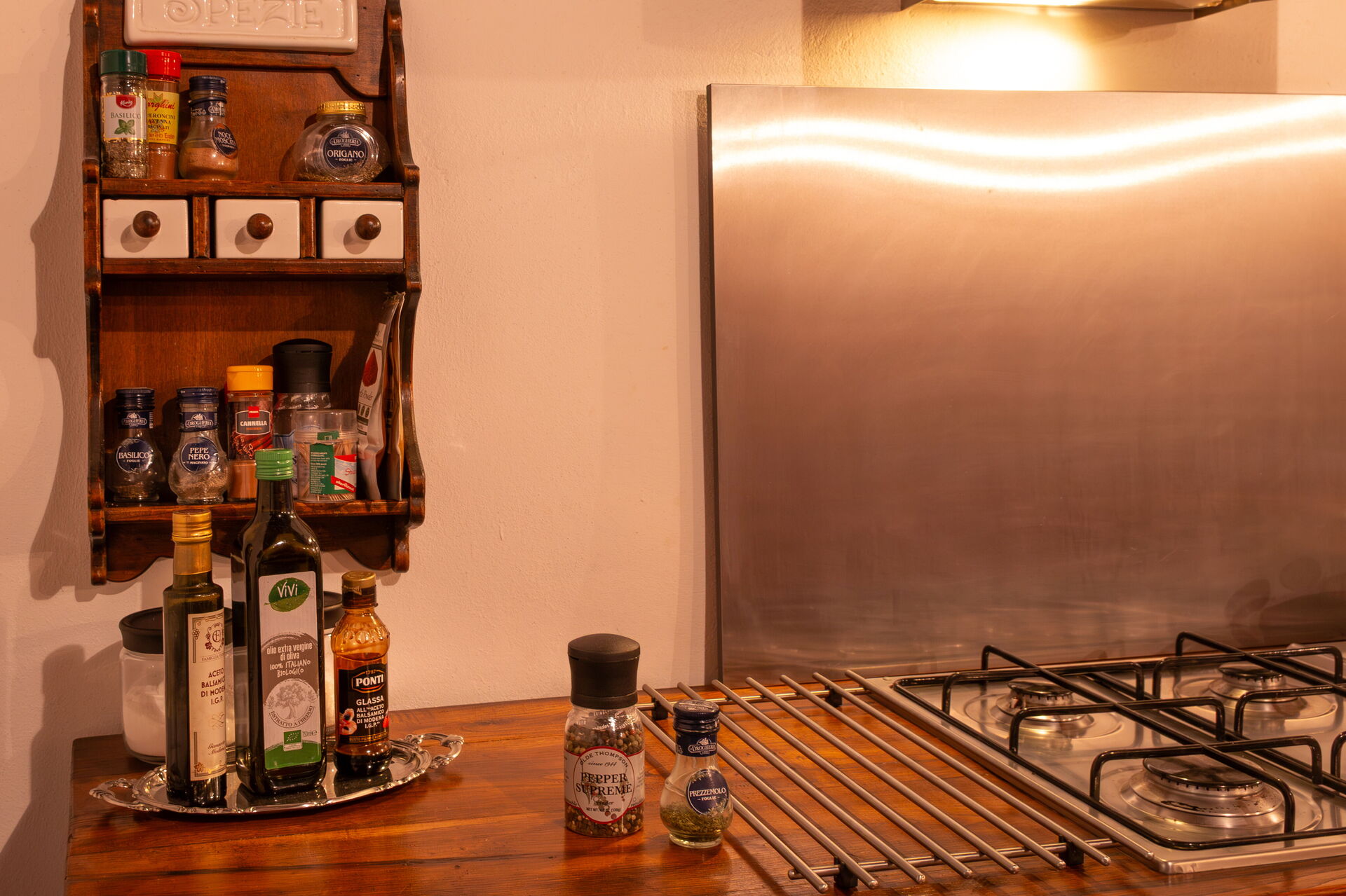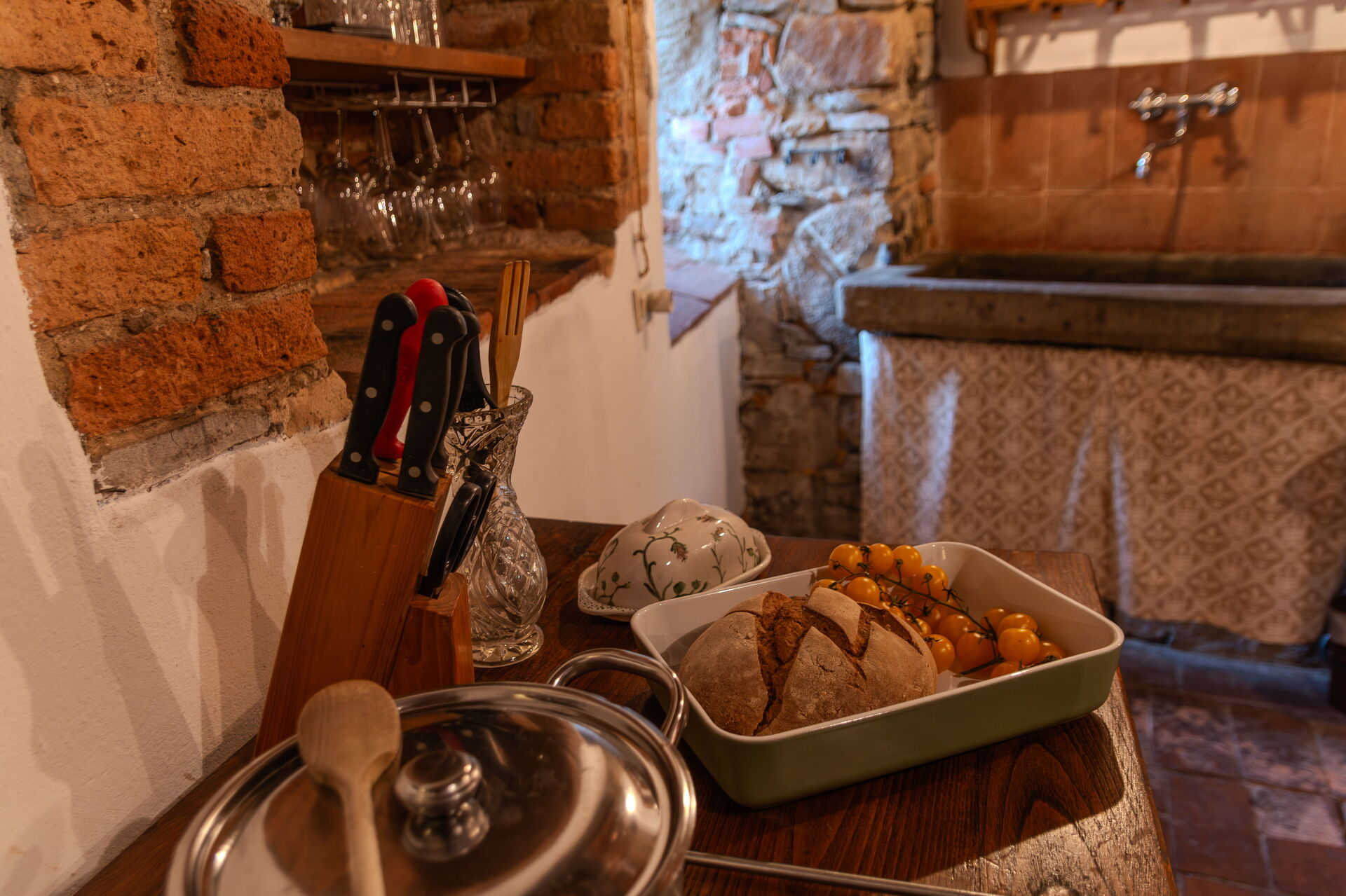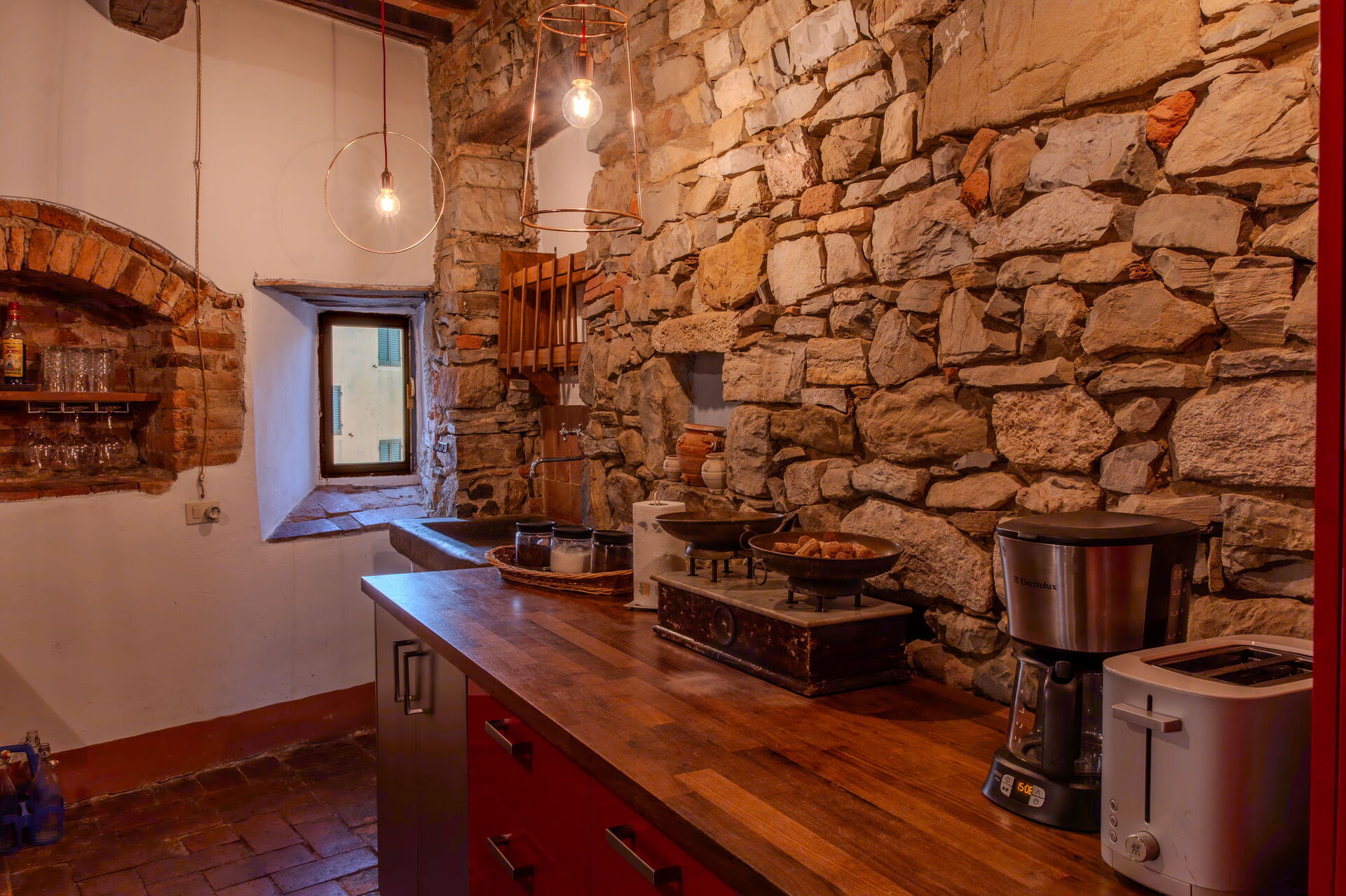 A beautiful red bricks' arch leads to the kitchen with the original stone sink of the house, a very large counter with all you need for cooking and eating your home cooked Italian meals. A cute niche for cups and drinks gives an authentic touch to this modern furnished kitchen.