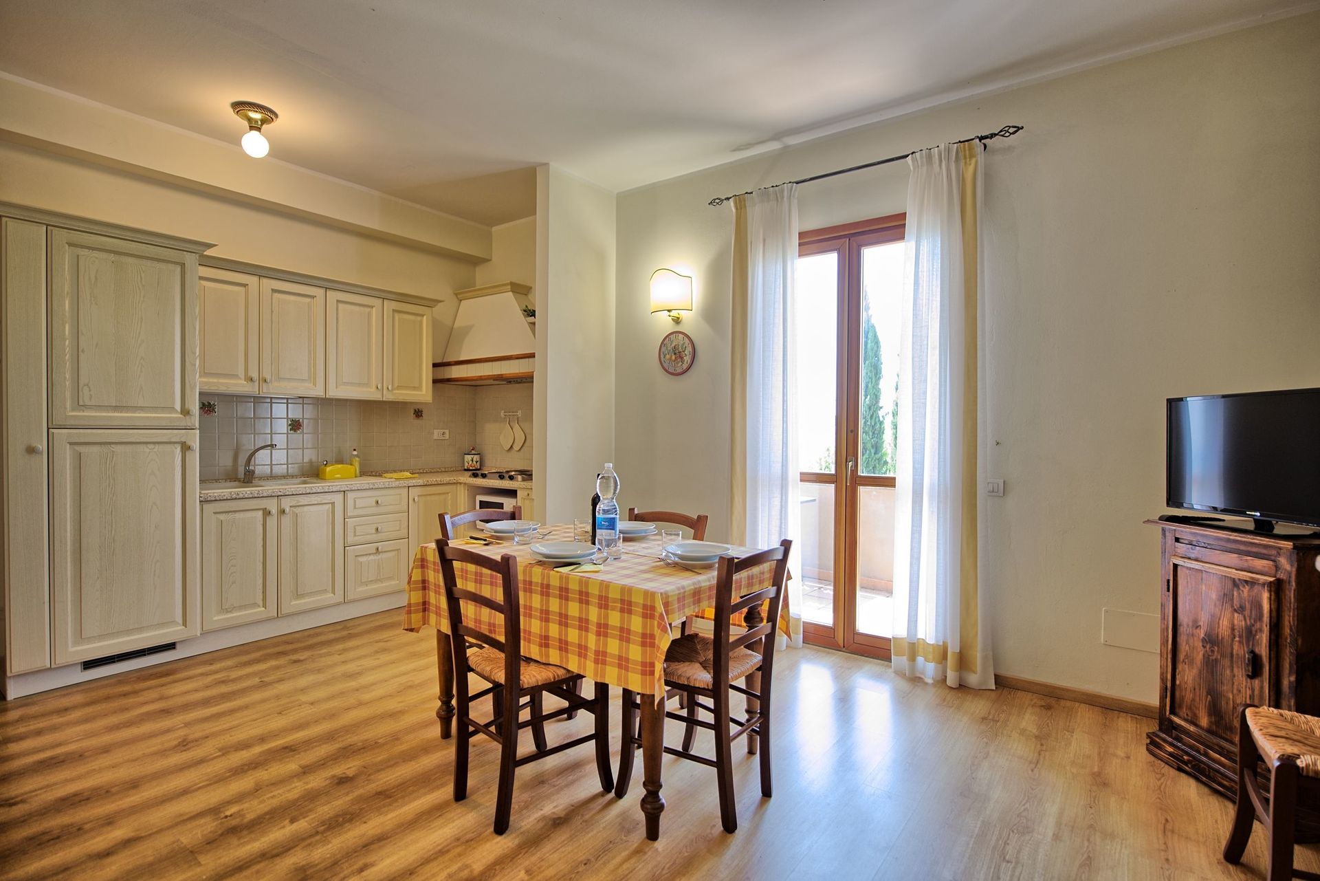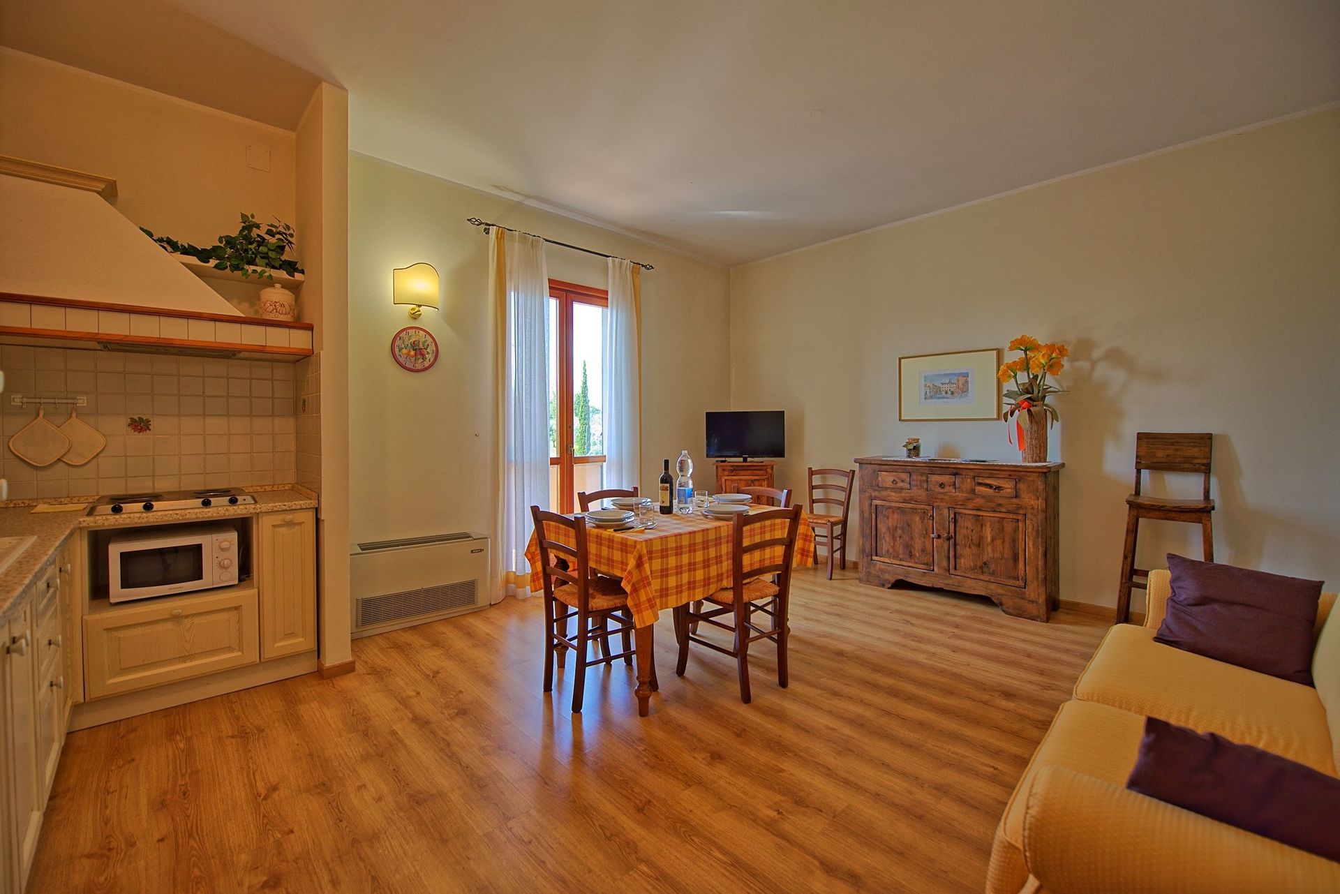 Ground floor: entrance into living area with sofa bed (double size) and dining area with kitchenette (microwave, fridge-freezer, electric hob with 4 rings) and access to a private terrace, double bedroom, bathroom with shower