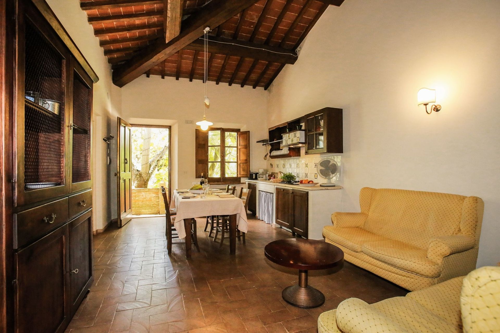 Kitchen + living room: well equipped kitchen, dining table, dishwasher, fridge, stove top, toaster, italian coffee machine, american coffee machine, sofa, armchair, WIFI internet, satellite tv.