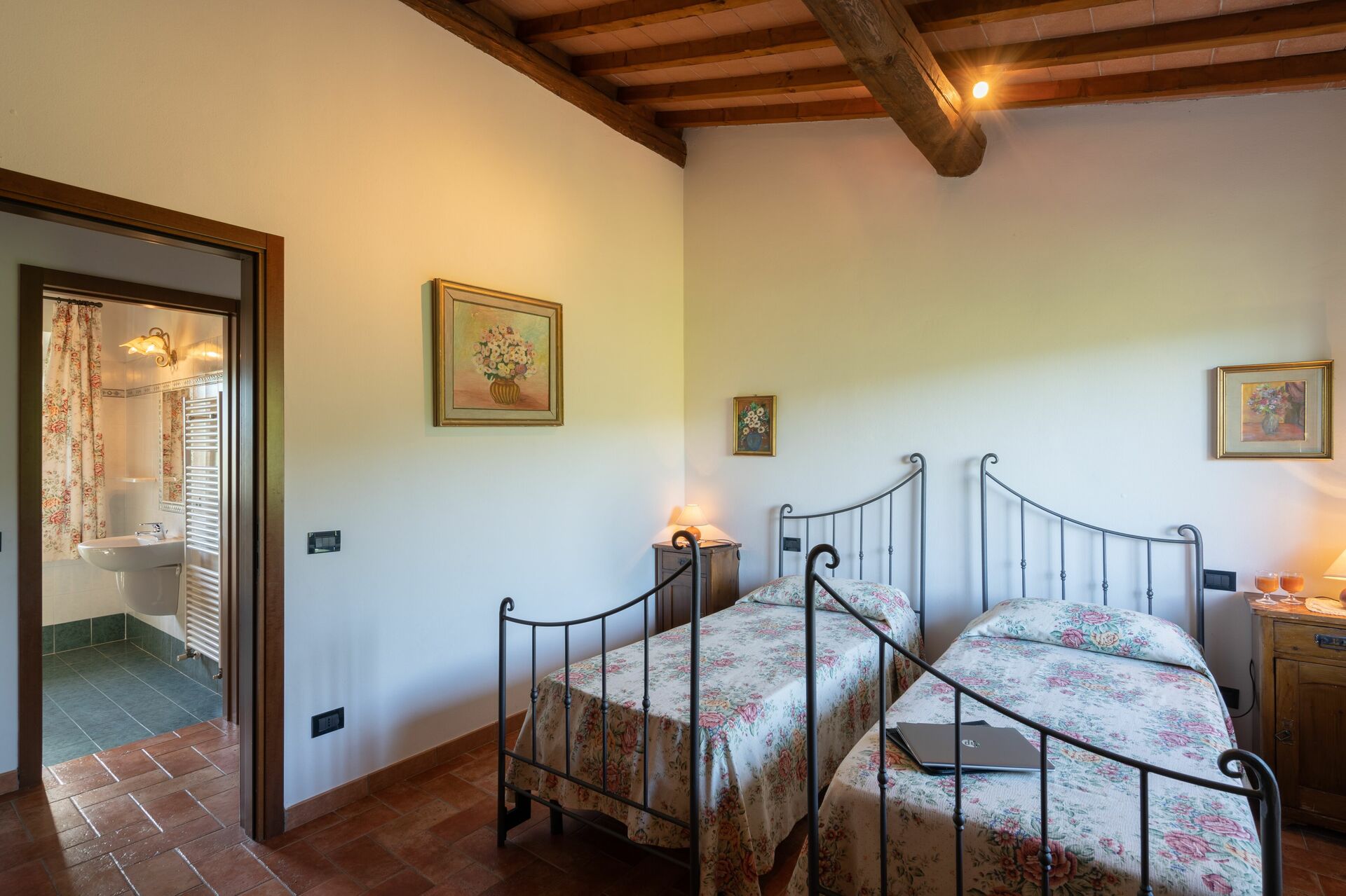 Bedroom + Ensuite Bathroom 2: two single beds, WIFI internet, basin, toilet, bidet, shower.