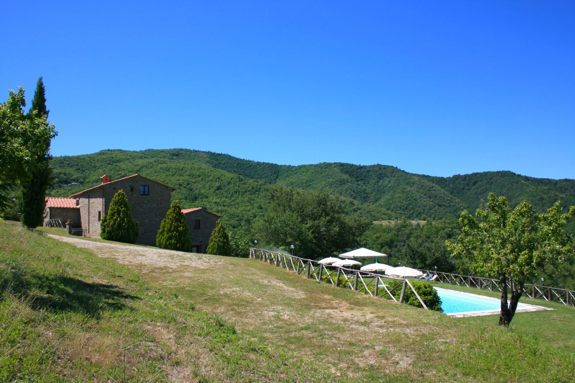 Pool, external spaces and typical Tuscan meals. Close to the villa there is a wide green area equipped with outdoor furniture and a 6x12 m swimming pool (depth 1,20-2,40 m, completely fenced).
