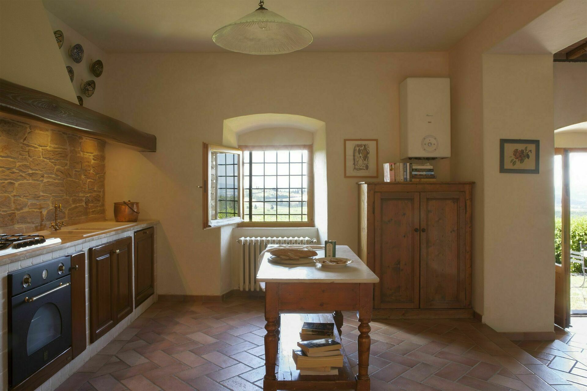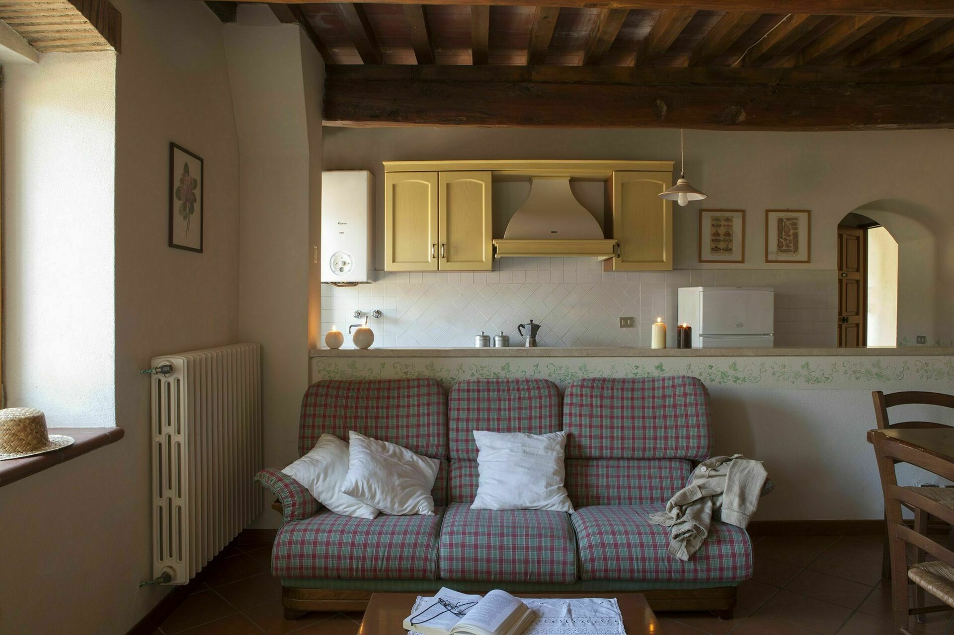 Kitchen + living room: dining table (people: 4), dishwasher, stove top, oven, italian coffee machine, sofa, armchair, fireplace.