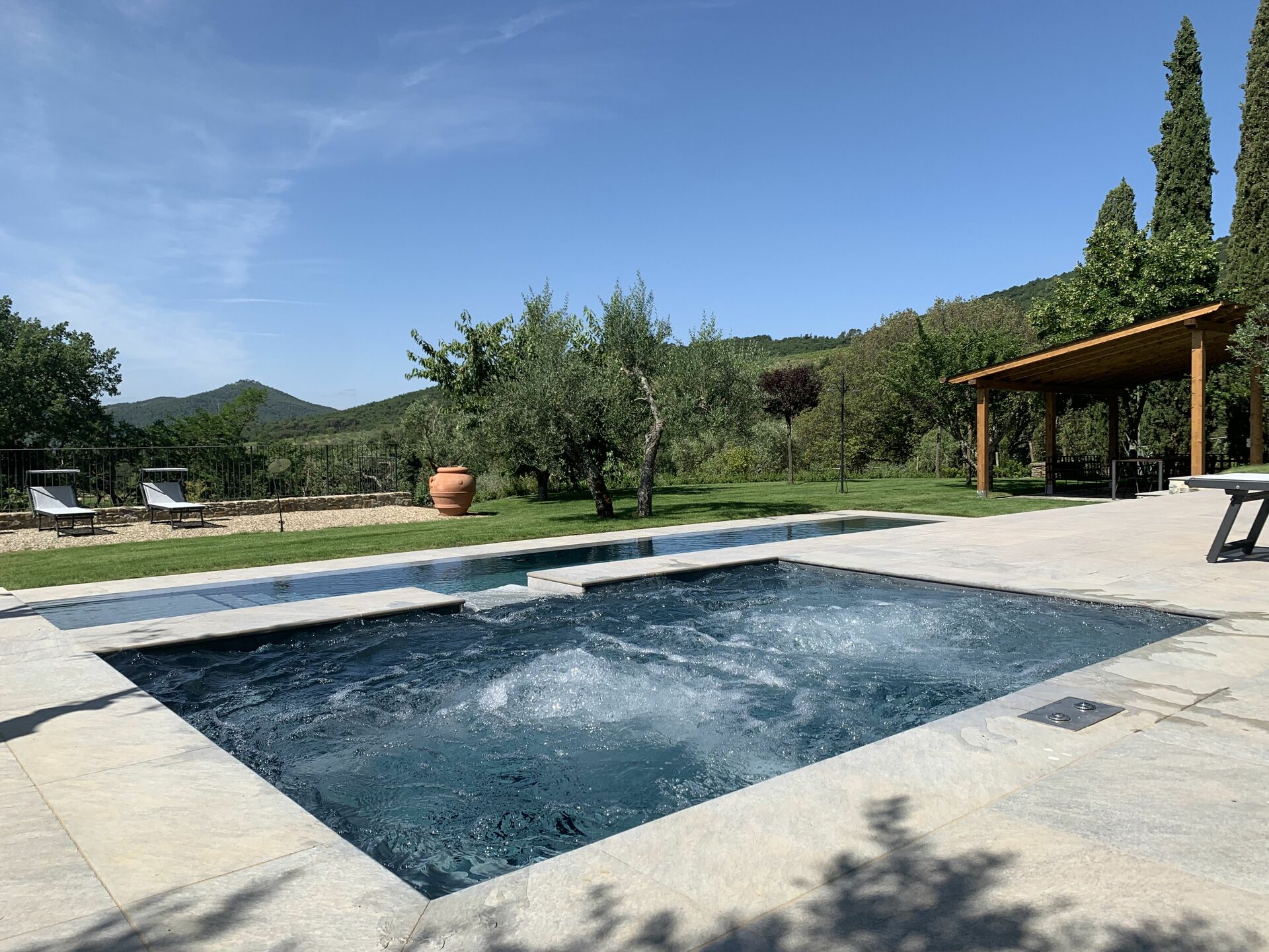 Garden: swimming pool (private, length: 12m, width: 6m, max. depth: 2m, min. depth: 1.2m, outdoor), al fresco dining, dining table (people: 6), gazebo, garden furniture, terrace furniture, ten sunbeds, fenced, enclosed property, children's playground.