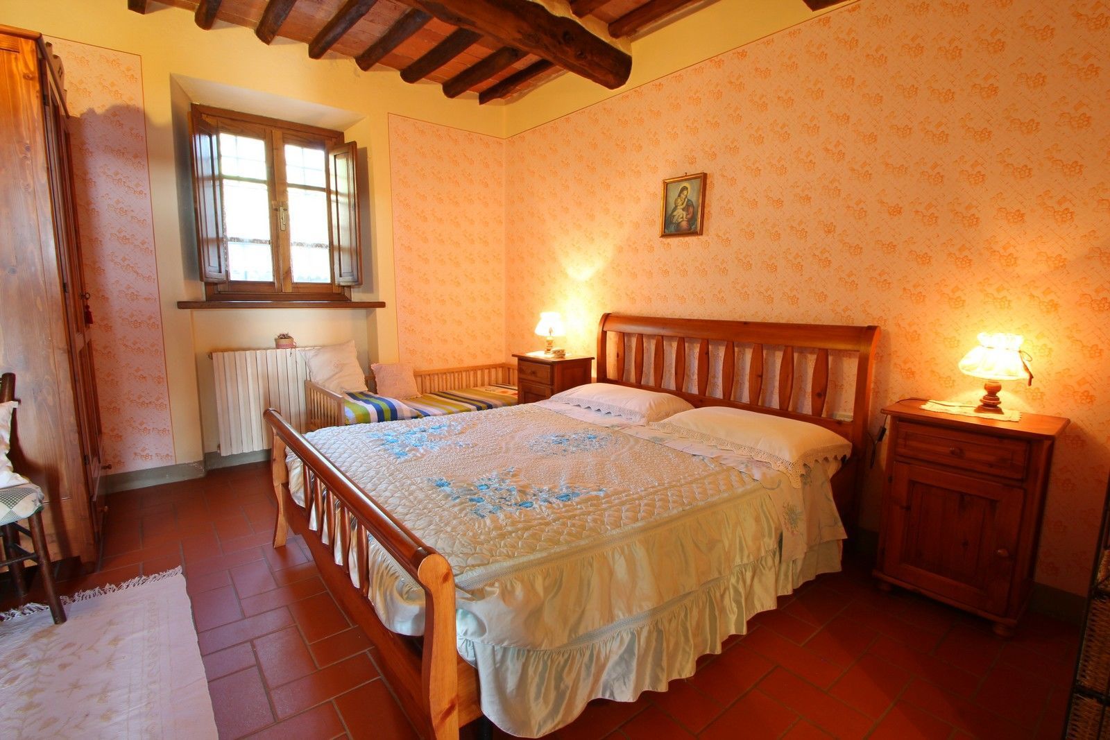 From the outside entrance you enter the living room with fireplace, bedroom with double bed and possibility to add a single bed, a bathroom with shower. Tuscan terracotta floors and wooden beam ceilings.