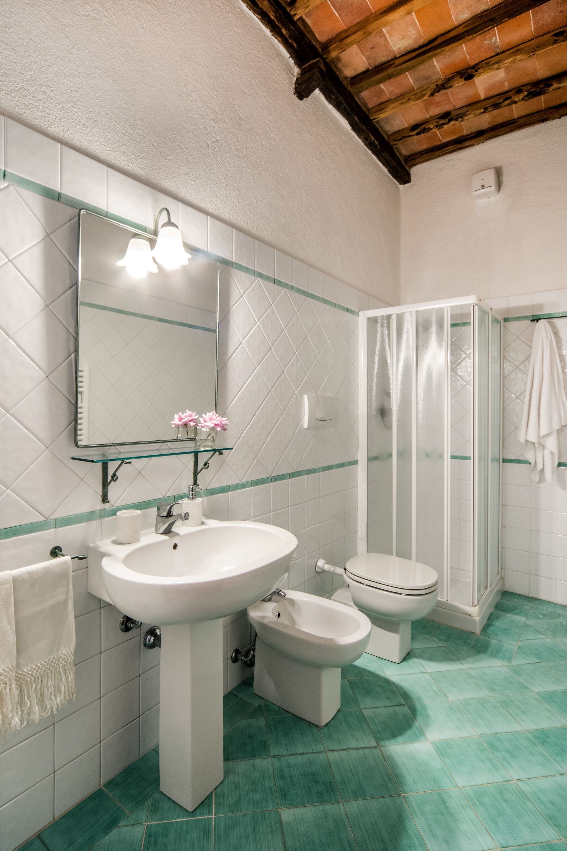 Casa Caterina, named after the wife of Ripostena’s owner when it was still a working farm, is located on the first floor of the main building. The apartment is reached with a stone staircase and is all on one floor. The apartment has a large living room with open space kitchen, a double bedroom and a bathroom with shower. The partially-enclosed terrace has pleasant views to the pool and woods and is complete with table, chairs, as well as chaise lounges. Owing to its position, the apartment stays cool even in the heat of summer. The camera has exposed wooden beams and is hand painted in charming pastels with a canopy bed effect. The ample living room has a comfortable sofa bed and open space kitchen equipped with a stovetop, oven, dishwasher, kettle, toaster and refrigerator. Upon request a microwave is available for your use.