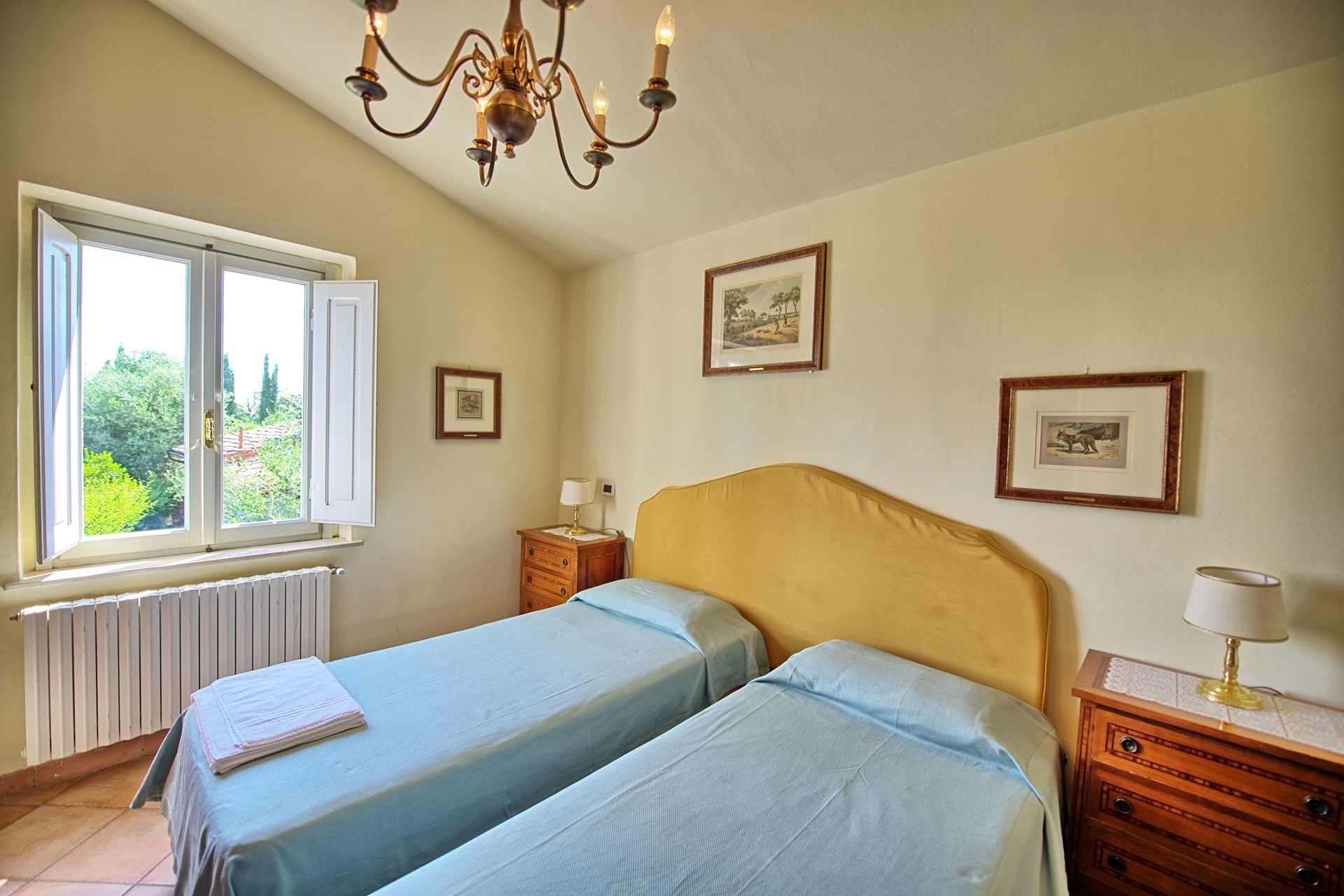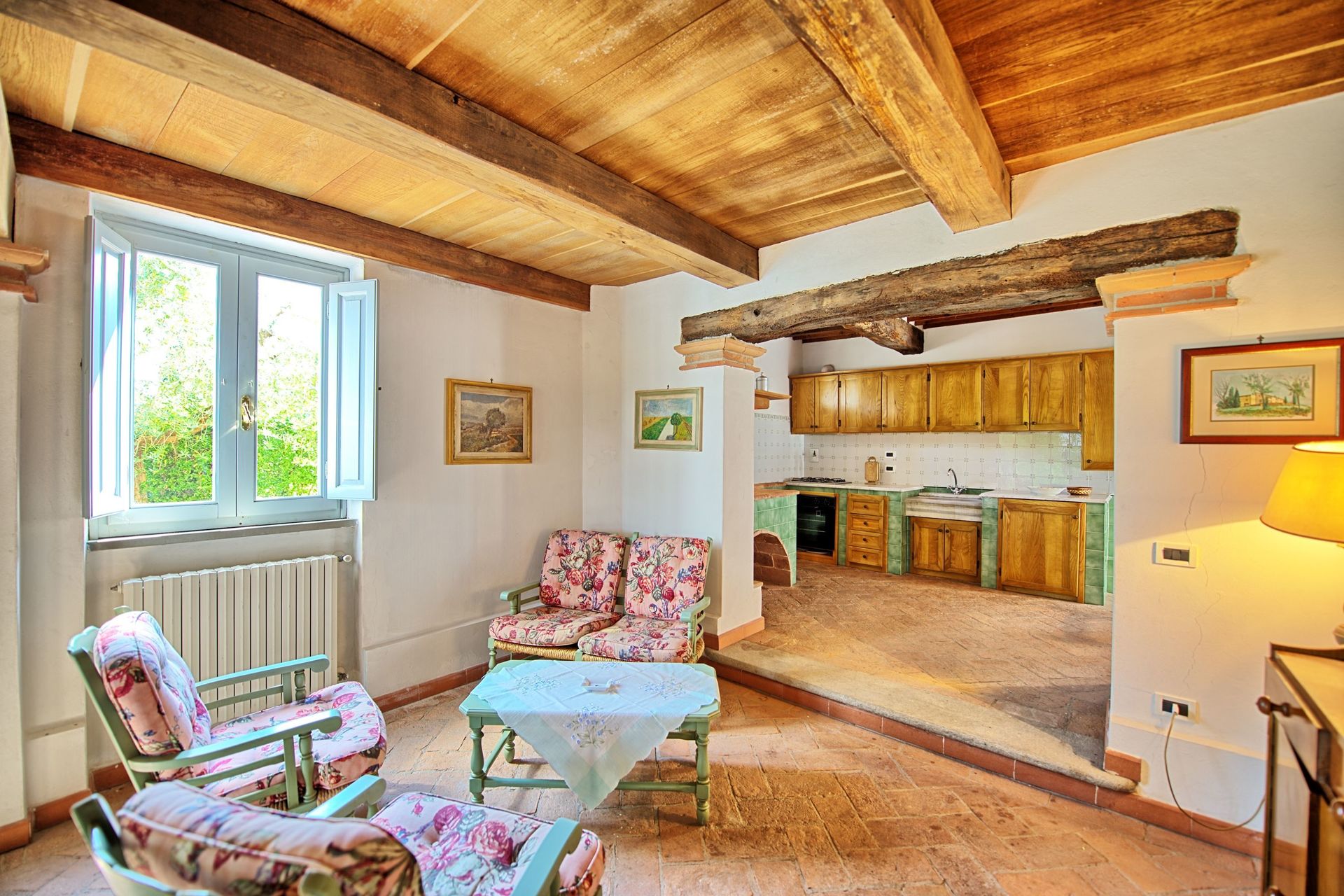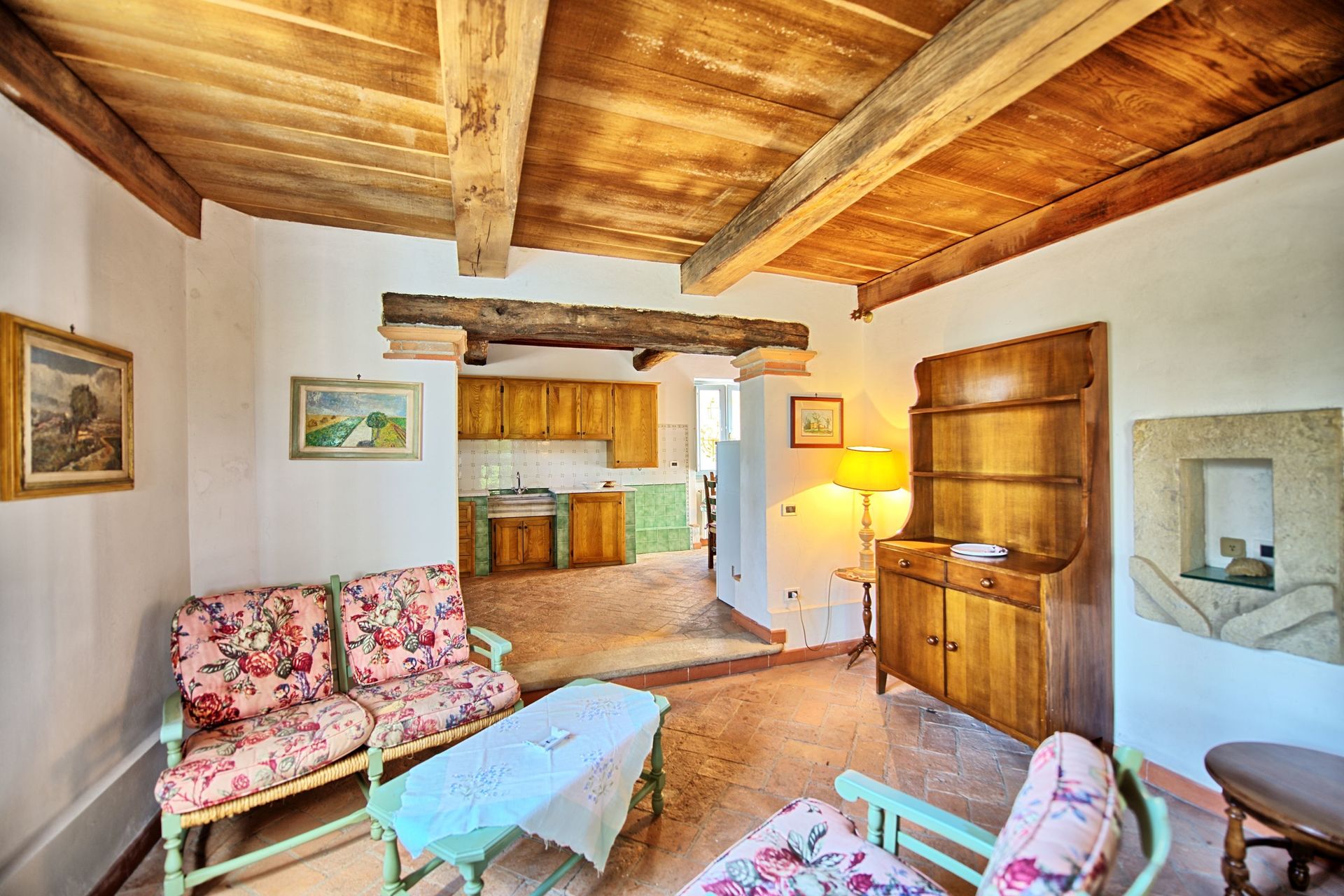 80 m2. Ground floor: living-room with kitchen corner (oven), dining area and fireplace. 1st floor: 2 double bedrooms, bathroom with tub, small bedroom with baby bed (to be required at the time a booking is confirmed - payment on the spot).