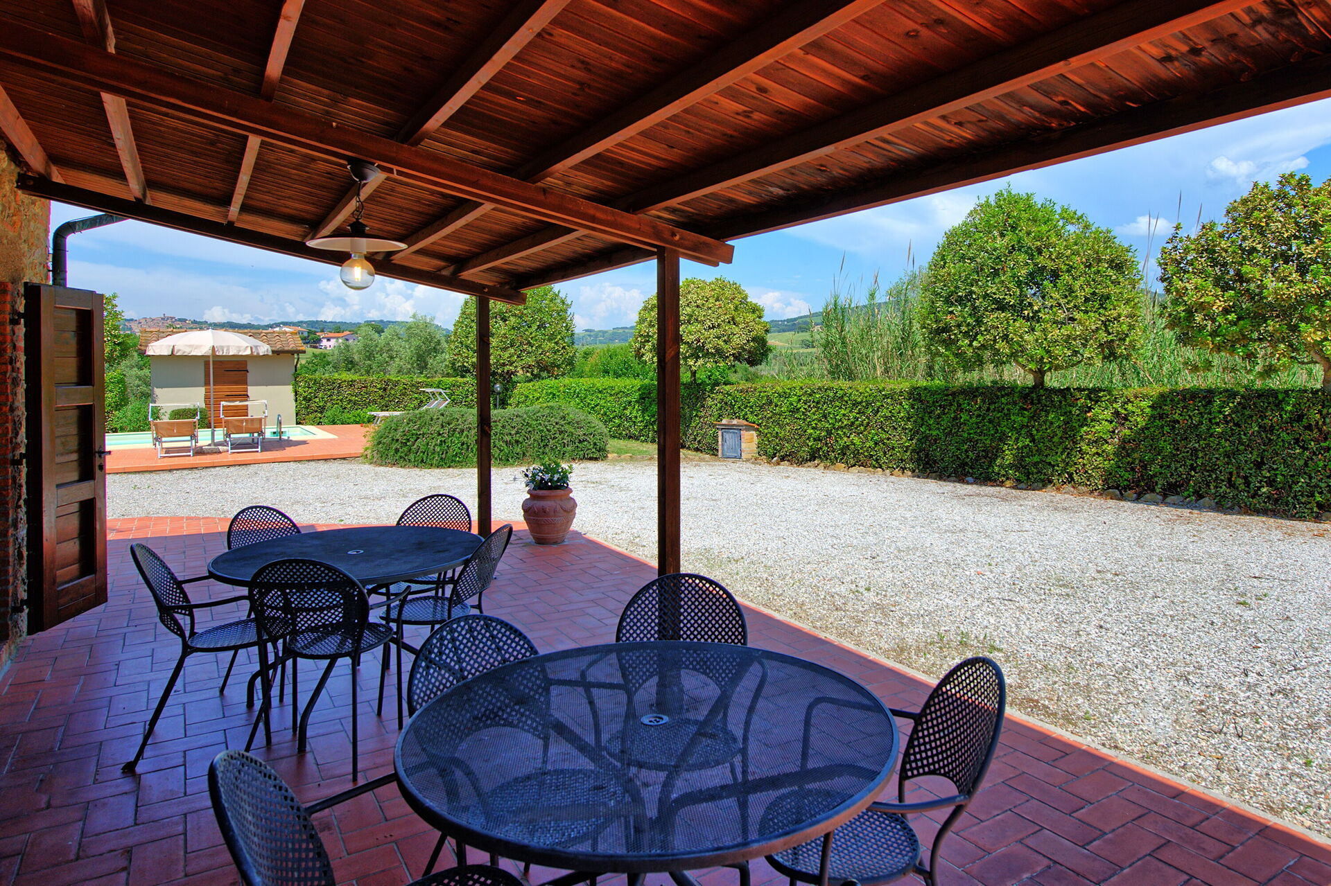 Outside, Cuccardino offers a beautiful well maintained garden and a fantastic swimming pool where you can spend the days in the hottest season. Also outside there is a barbecue area equipped to organize outdoor lunches and dinners, enjoying the panoramic view that extends over the surrounding countryside.