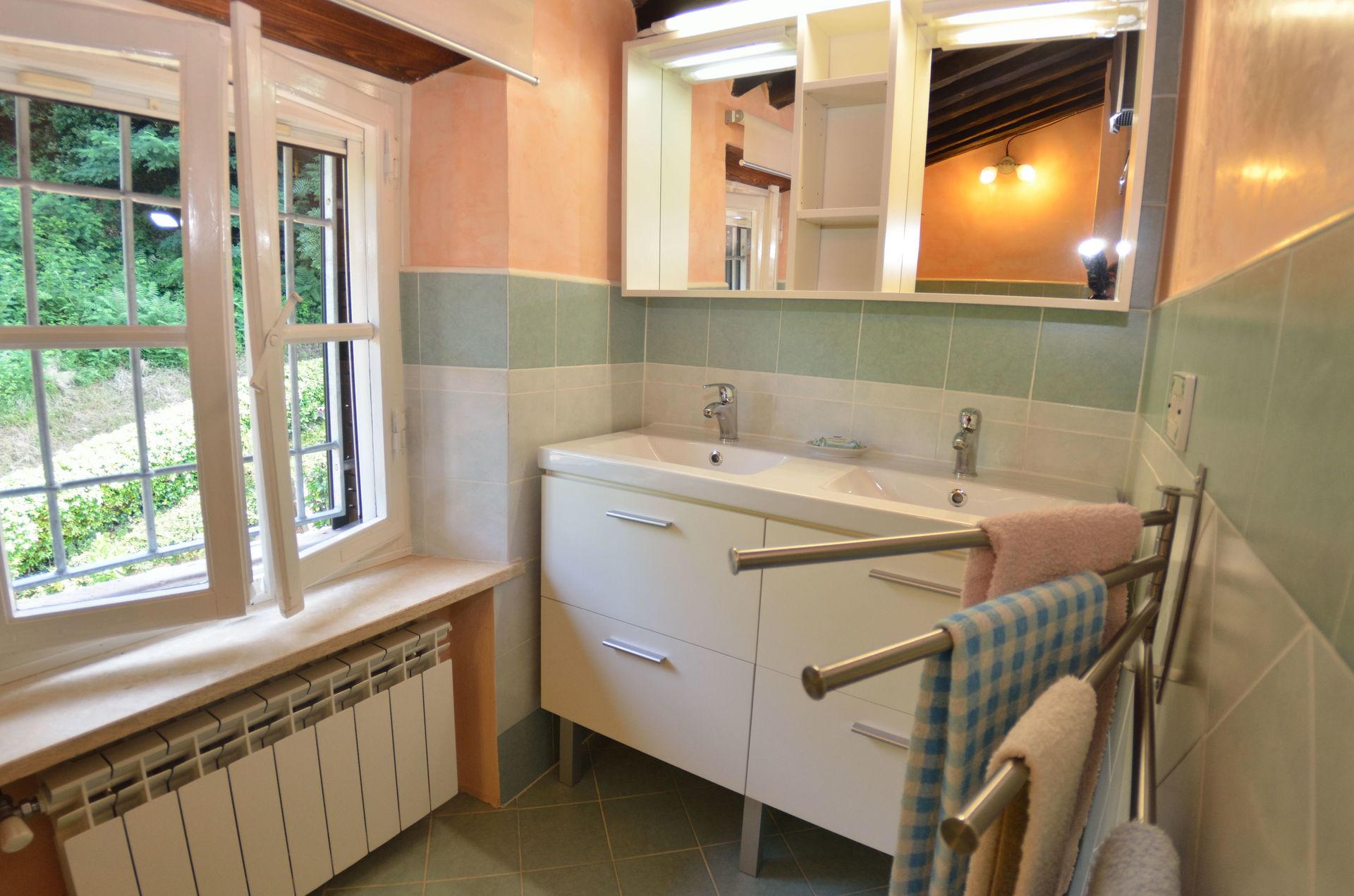 Bedroom + Ensuite Bathroom: double bed, two basins, toilet, bidet, shower.