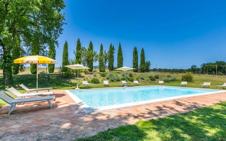 The outdoor spaces at "Podere S Giovanni" are truly among the property's most remarkable features, designed to make the most of the spectacular hilltop setting and the natural beauty of the surrounding countryside. The private swimming pool, measuring 6 x 12 m with a depth ranging from 30 to 145 cm, is equipped with an internal staircase and a salt-electrolysis pool-cleaning system, ensuring a clean and comfortable swimming experience throughout your stay. A dedicated outdoor shower is conveniently located nearby for rinsing off after a swim. The furnished terrace provides an ideal setting for open-air dining and socialising, with garden furniture thoughtfully arranged to take full advantage of the panoramic views. A barbecue is also available, making al fresco dinners a genuine pleasure during warm summer evenings. The private park of 3,000 m2 surrounds the property with cultivated grounds, offering a tranquil green space where you can stroll, relax, and immerse yourself in the authentic atmosphere of the Tuscan hills. A sun terrace further extends the outdoor living areas, providing a perfect spot to enjoy the sunshine and the sweeping views of the rolling landscape.