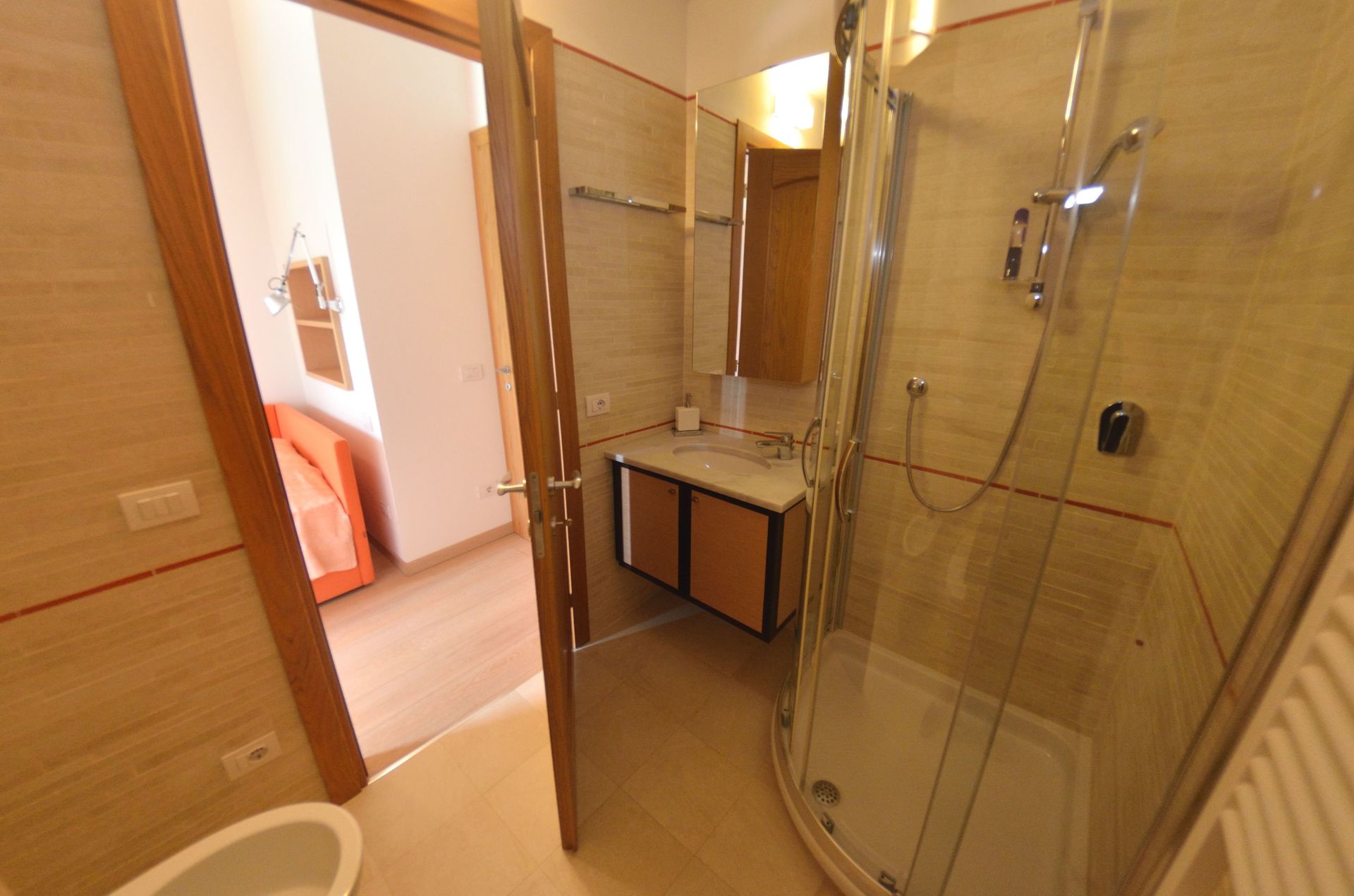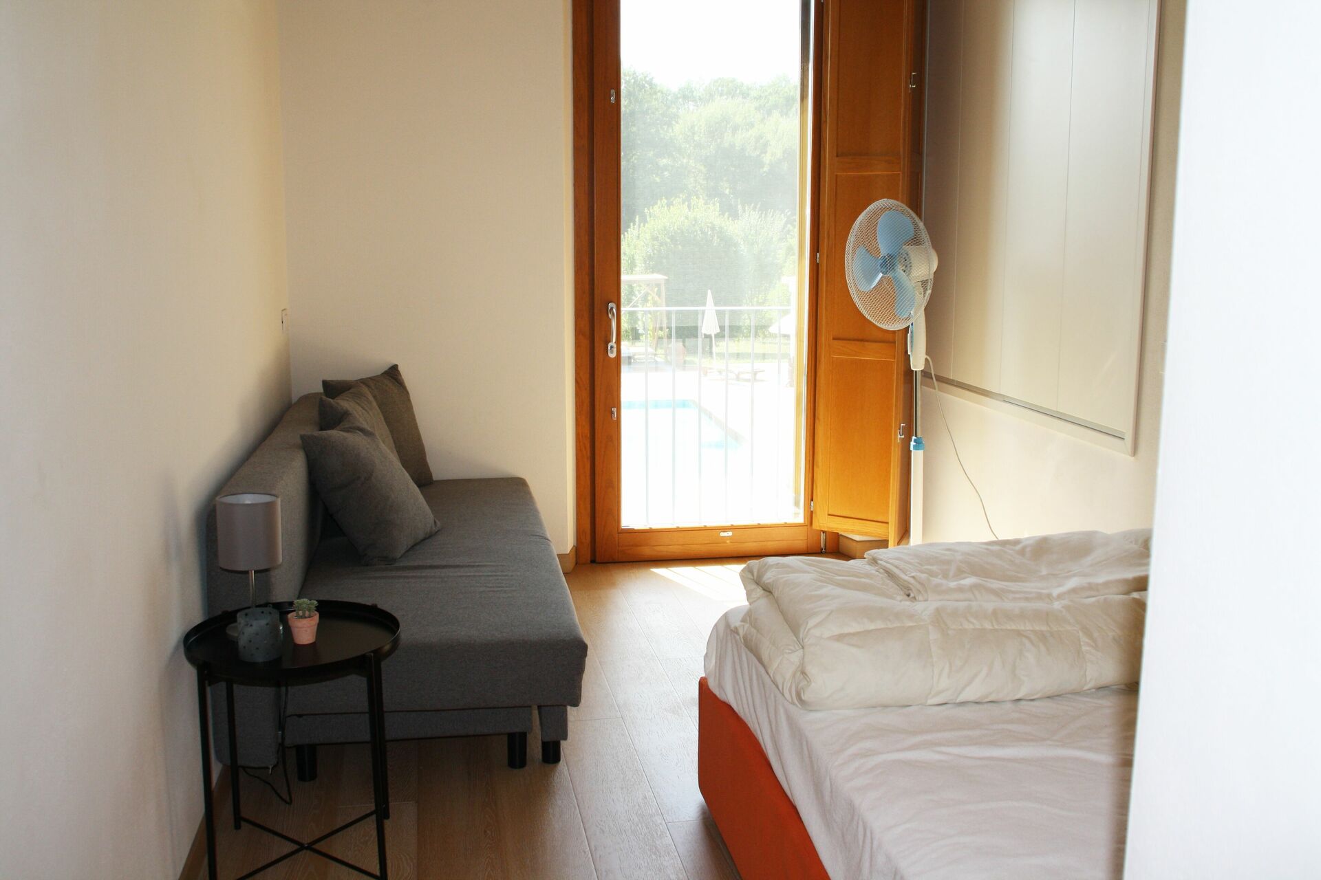 Bedroom + Ensuite Bathroom 1: french bed (width: 1.2m), sofa bed, basin, toilet, shower.
