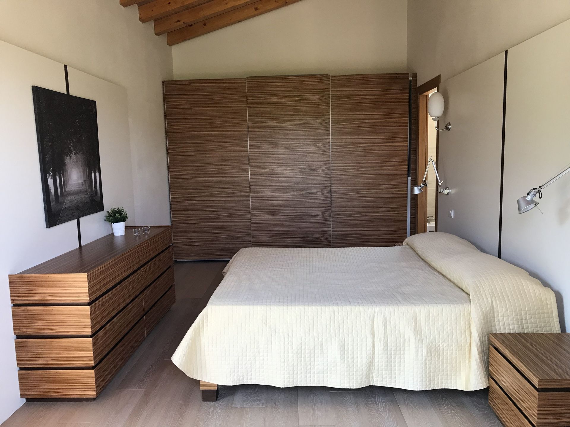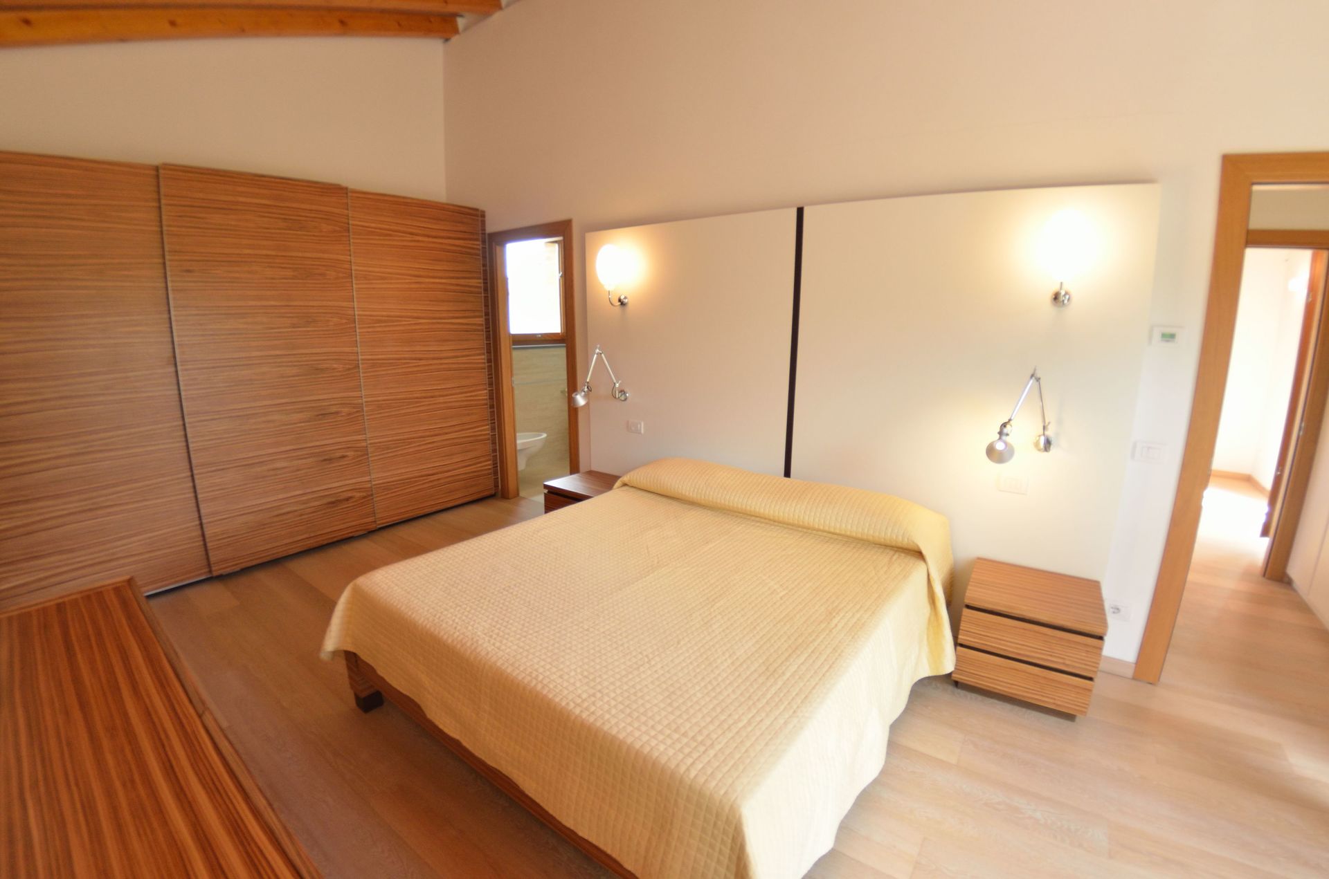 Bedroom + Ensuite Bathroom 2: double bed, basin, toilet, shower.