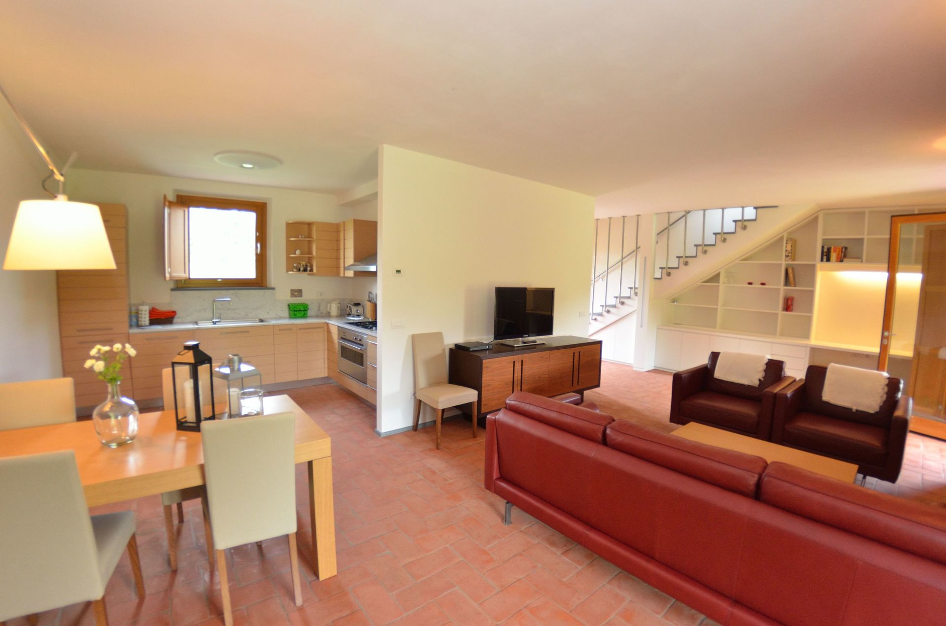 Open space: sofa, two armchairs, dining table (people: 4), television, fridge, stove top, freezer, dishwasher, well equipped kitchen, oven, american coffee machine, exit to the veranda.