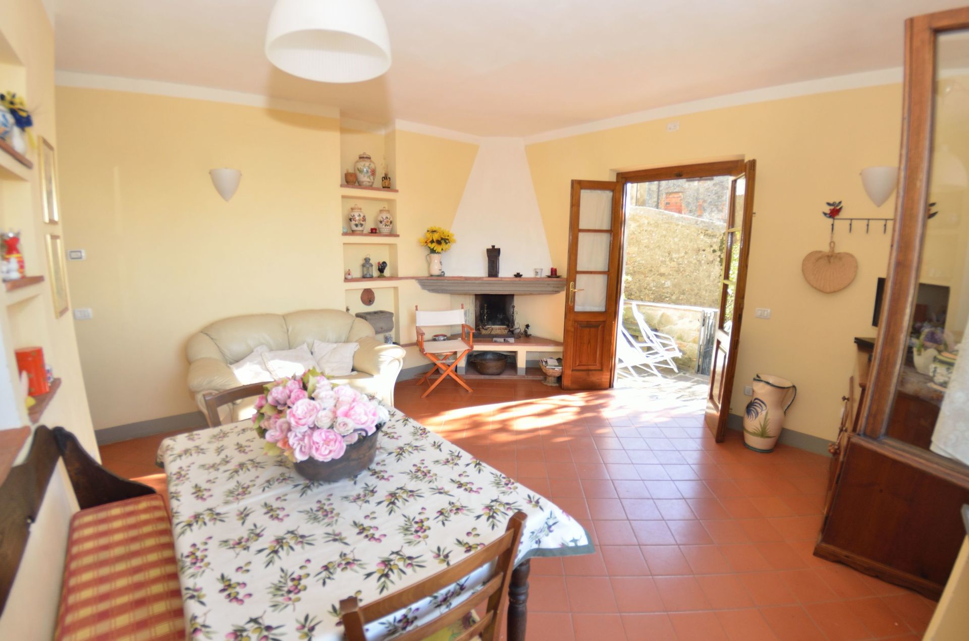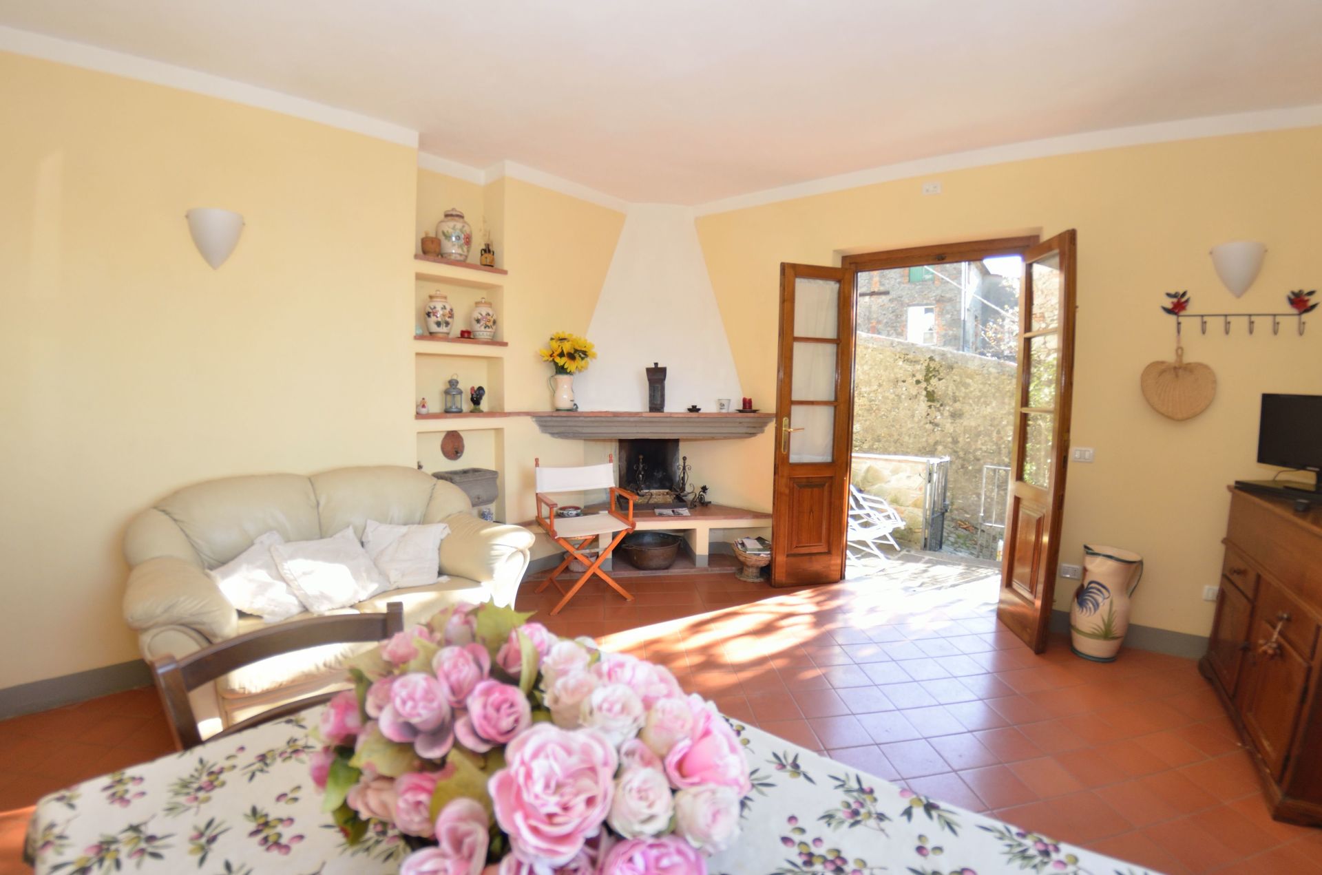 Living room: two armchairs, fireplace, dining table (people: 4), television, exit to the terrace.