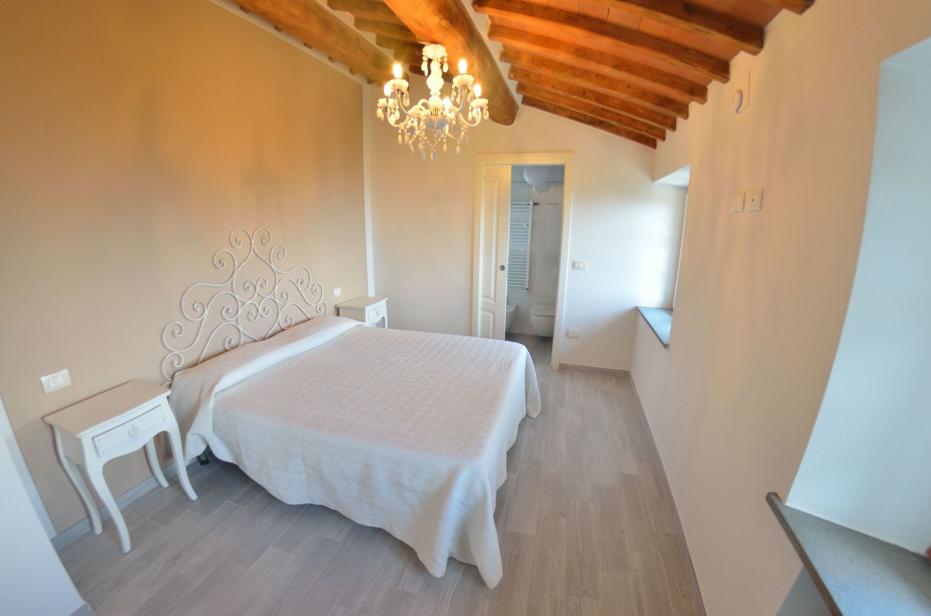 Bedroom + Ensuite Bathroom 2: double bed, basin, toilet, bidet, shower.