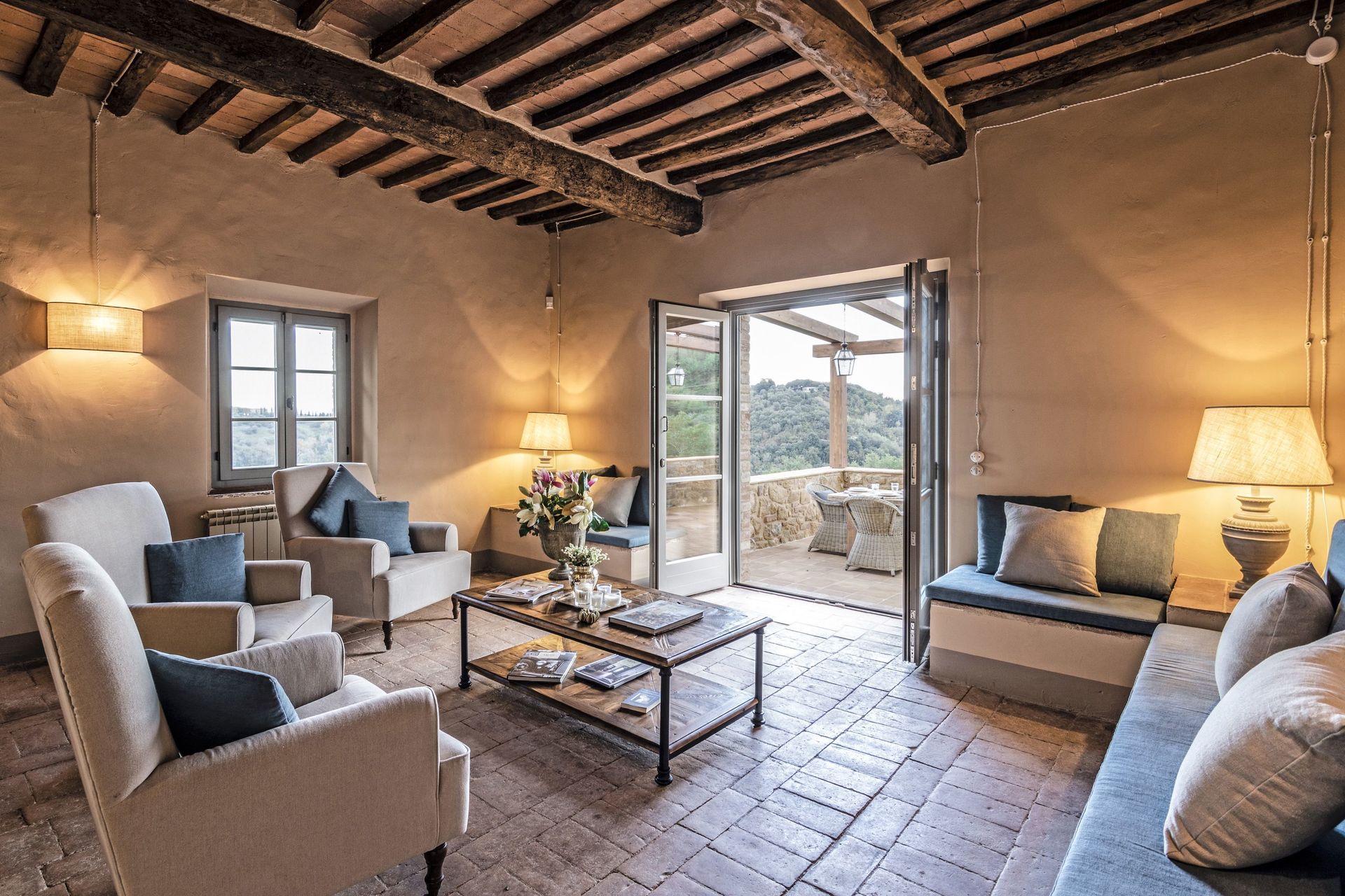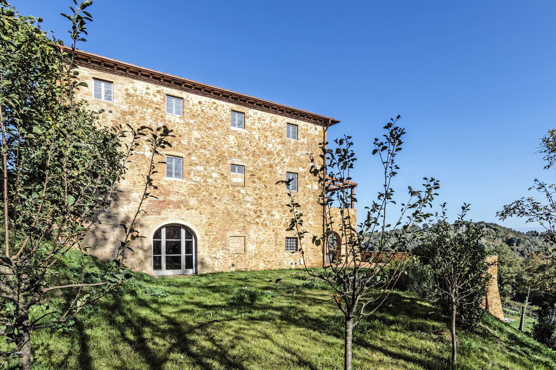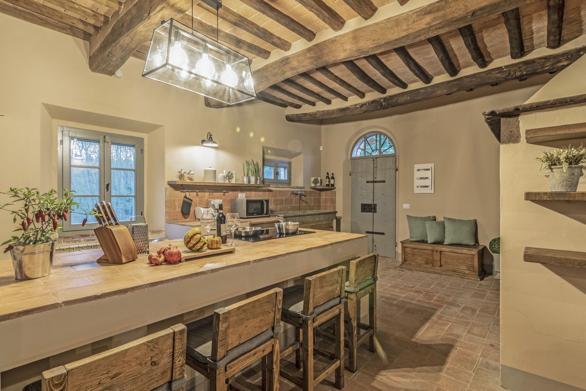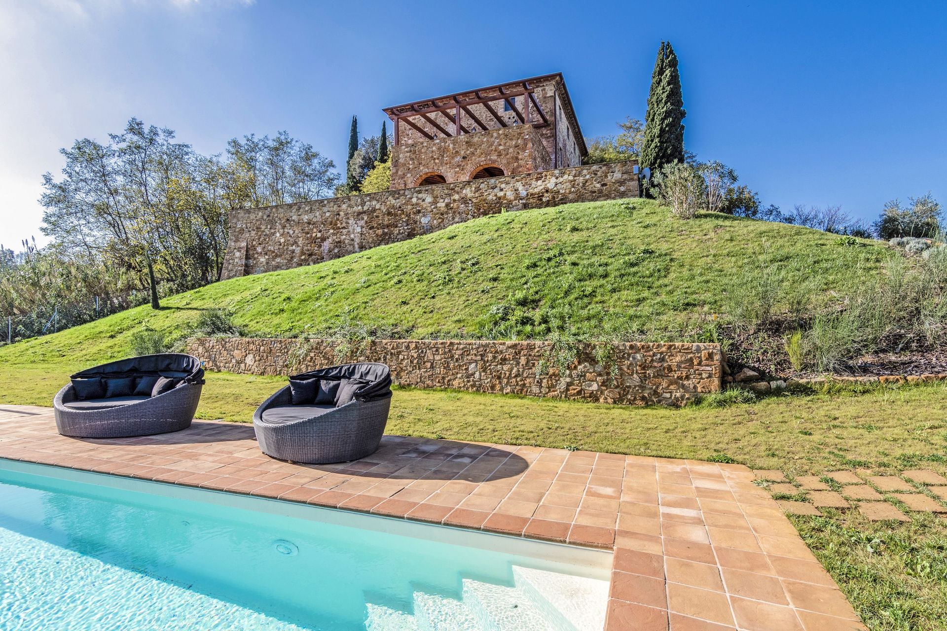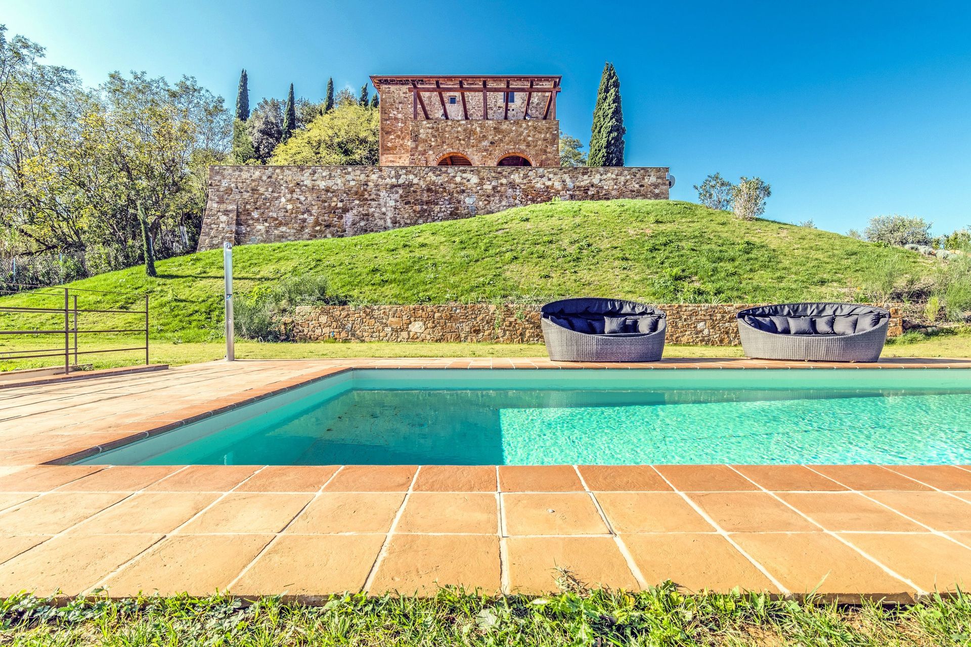 The villa sits in a tranquil area with panoramic views, surrounded by nature while at the same time close to historic places such as Volterra, San Gimignano, Pisa, Lucca and Florence.