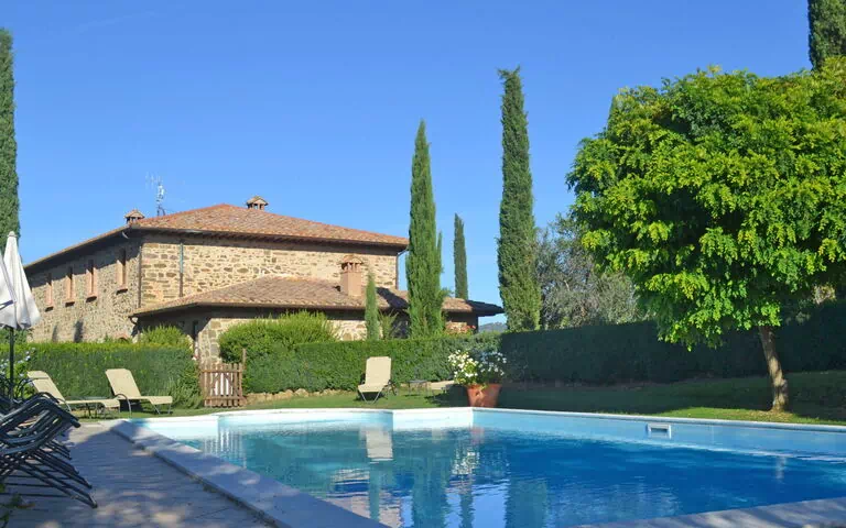 This beautiful Montenero d'Orcia vacation rental features a large swimming pool, yard, internet WiFi, and parking amenities. The property consists of a main house that accommodates up to ten guests and an annex that sleeps six, situated just 15 meters away. The serene setting, surrounded by trees and vineyards, provides a peaceful environment.