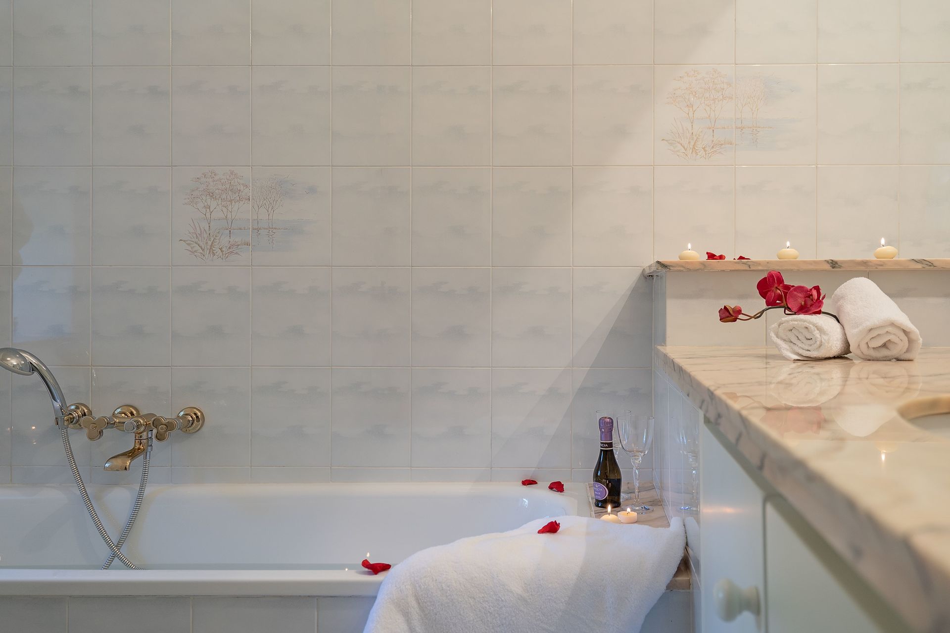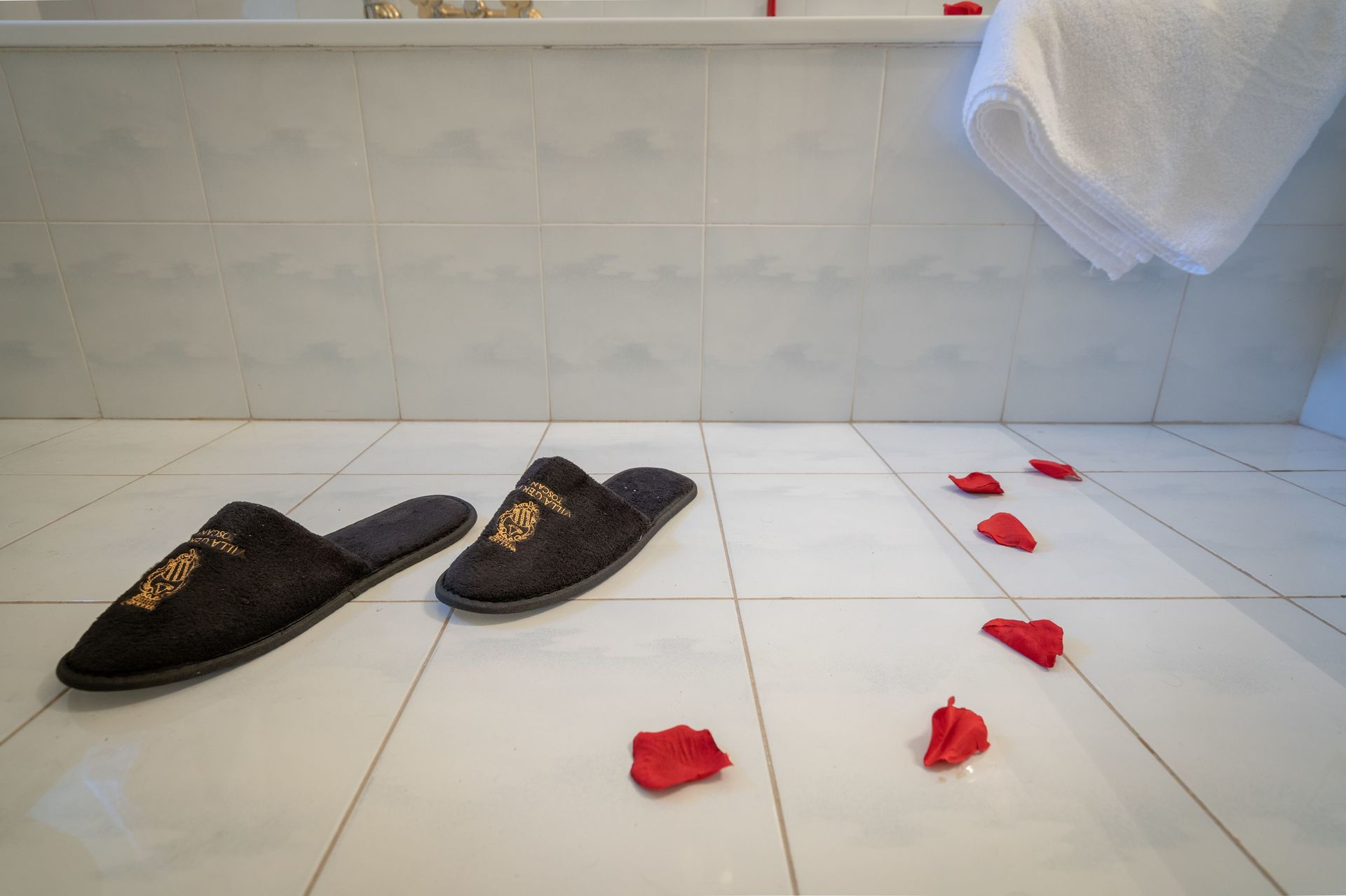 Bedroom + Ensuite Bathroom 2: double bed, mosquito net, whirlpool bathtub, basin, toilet, bidet, hairdryer.