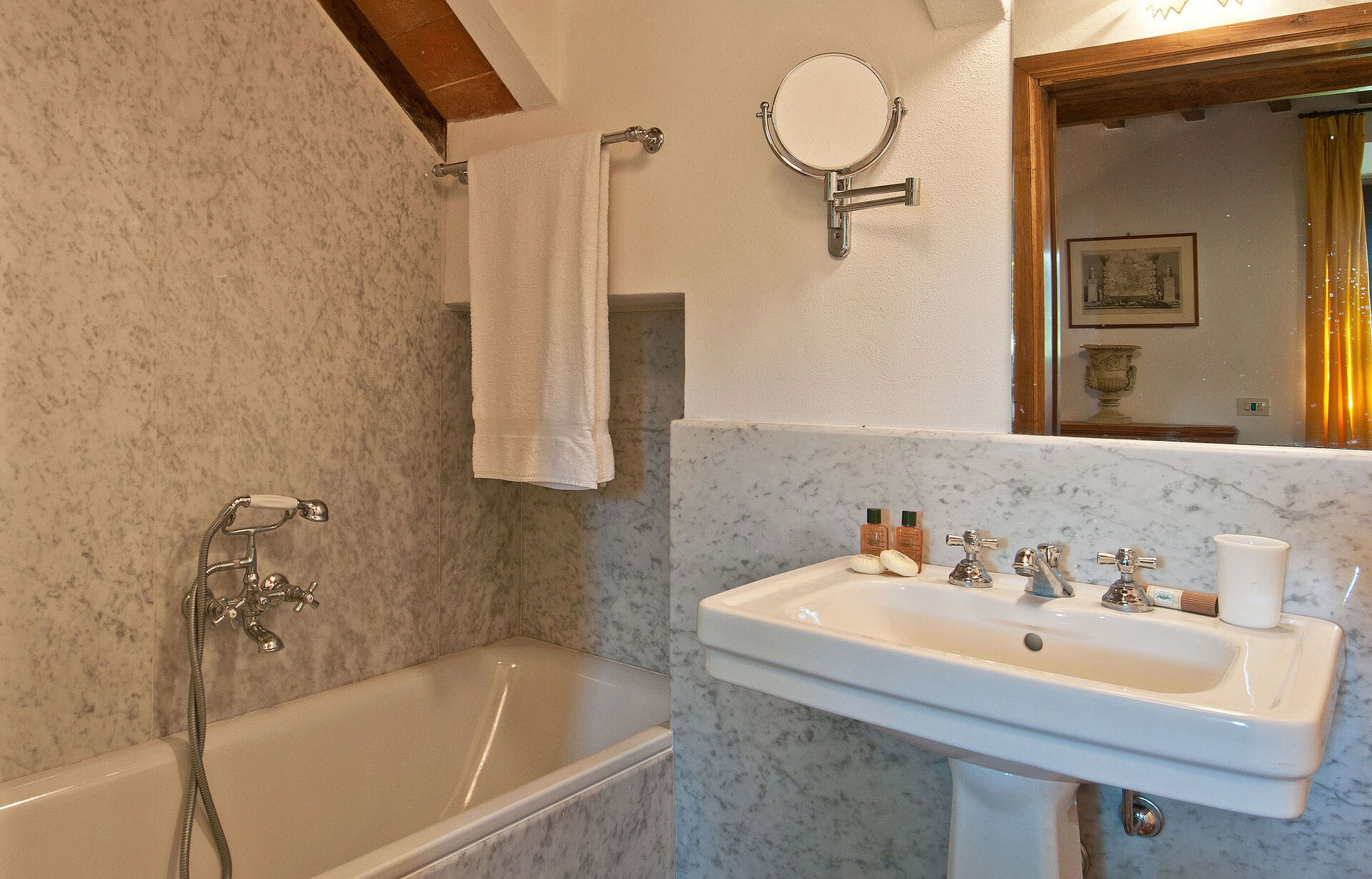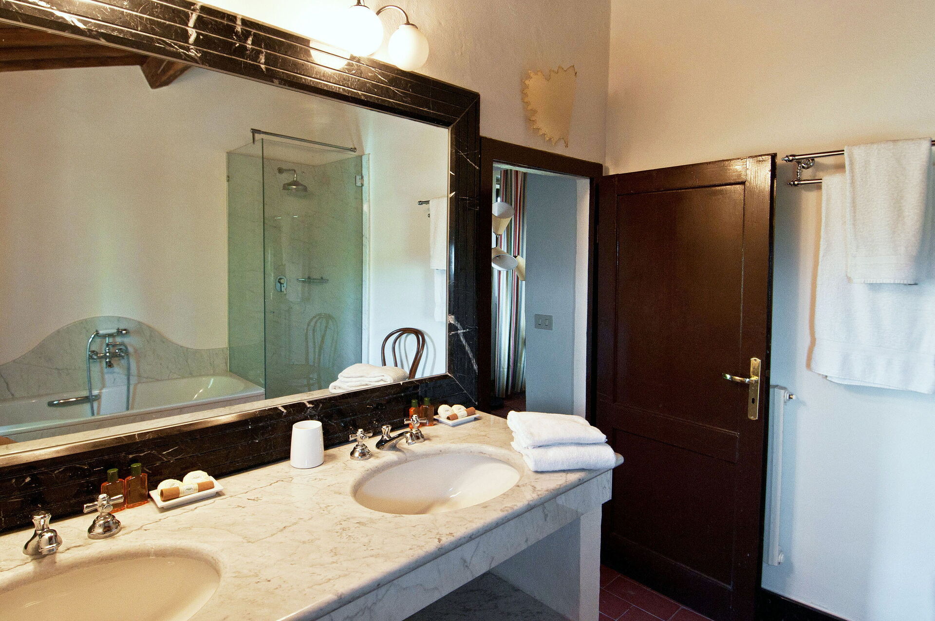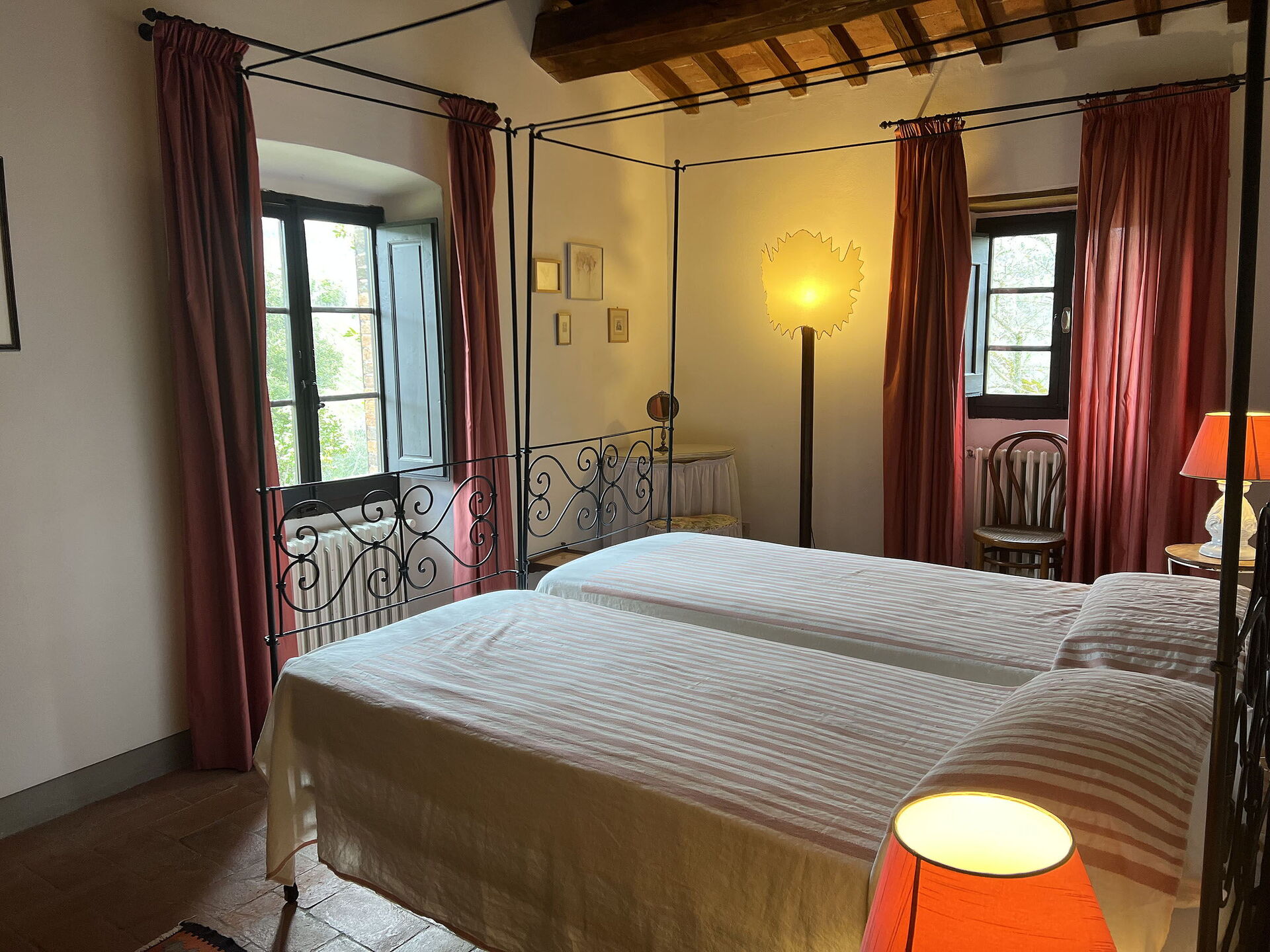 Bedroom + Ensuite Bathroom 1: two single beds, WIFI internet, mosquito net, double basin, toilet, bidet, bathtub, shower, hairdryer, exit to the garden.
