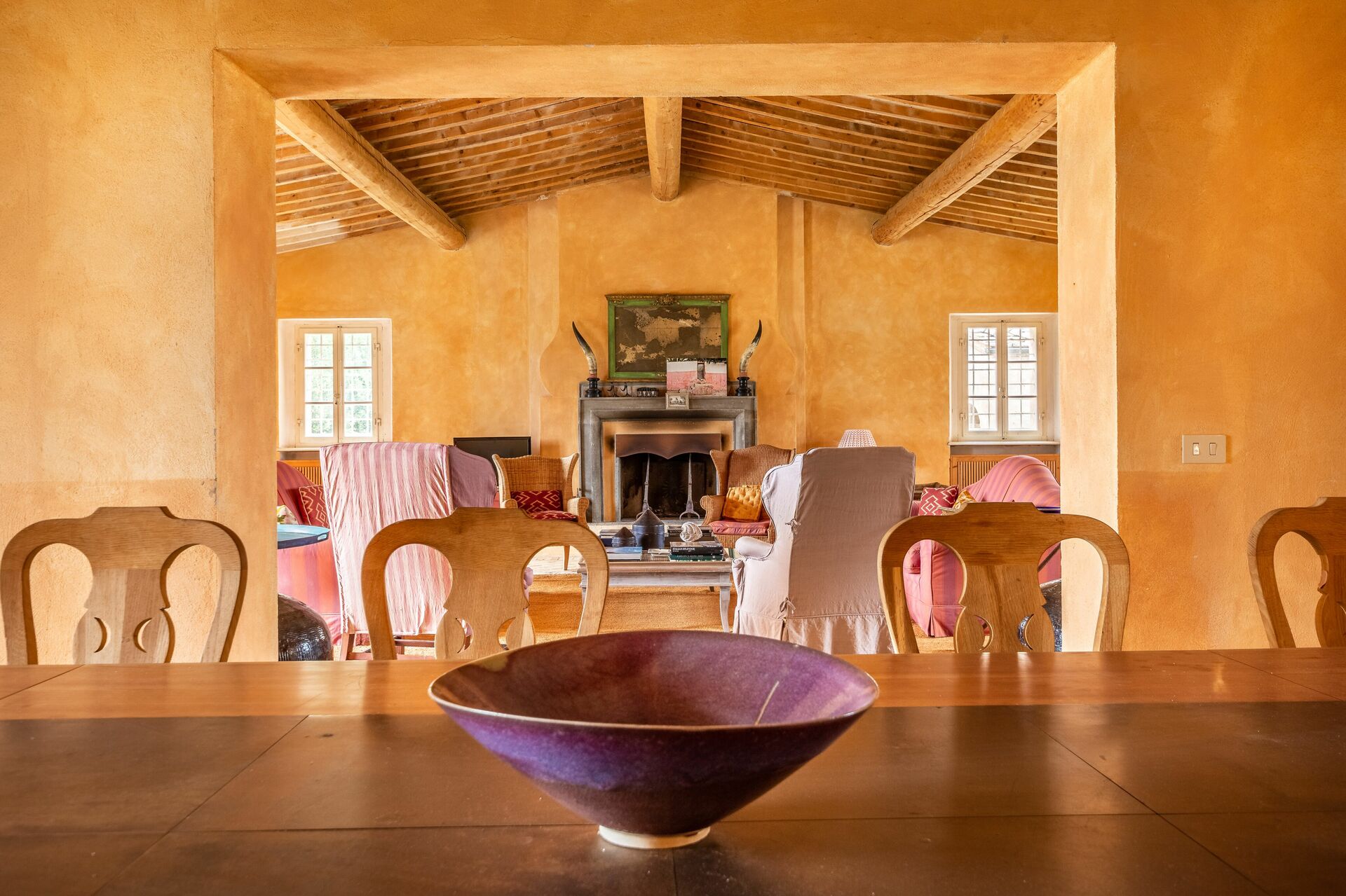Dining room: dining table (people: 16), WIFI internet, fireplace, exit to the garden, exit to the patio.