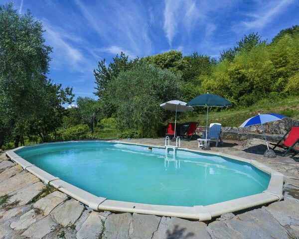 The outdoor spaces at "Belvedere" are thoughtfully arranged to make the most of the property's elevated countryside setting. The kidney-shaped swimming pool, measuring 8 x 5 metres, is the centrepiece of the exterior and is available seasonally from 1 May to 30 September. Adjacent to the pool, a fully equipped pool house provides practical amenities including a fridge and a cooking stove, making outdoor living both comfortable and convenient. A pergola offers a shaded retreat for relaxing during warm Tuscan afternoons, while the terrace provides an ideal setting for outdoor dining and socialising. Garden furniture is available throughout the exterior spaces, and a barbecue is on hand for alfresco meals in the open air. The surrounding natural property of 7 hectares, featuring trees, meadow, and an orchard, creates a verdant and private backdrop that enhances the overall outdoor experience.