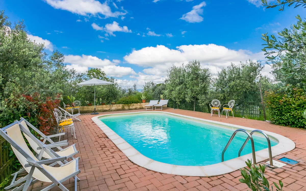 Rustico la Casina is a charming single-family house nestled among the olive trees on the rolling hills between Vinci and Florence, offering complete privacy and relaxation in the tranquil Florentine countryside. It is an ideal vacation rental for families or groups of friends, featuring a swimming pool, yard, internet wifi, and parking. The property sits on 1,000 m2 of fenced land and provides modern amenities amidst the picturesque Tuscan landscape.