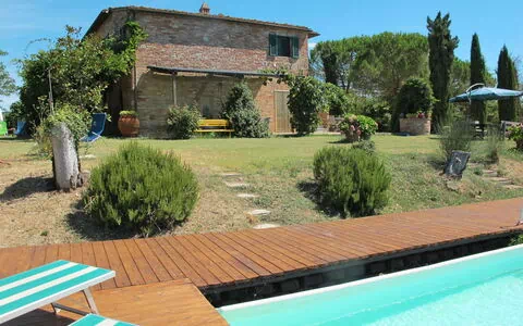 Country house "Santa Croce", surrounded by trees, meadows, fields and vineyards. 4 apartments in the residence. 6 km from the centre of Siena, 2 km from the centre of San Rocco a Pilli, outside the resort, 55 km from the centre of San Gimignano, 4 km from the river. For shared use: terraced garden, 600 m2 (not fenced) with trees, natural garden, meadow, swimming pool (8 x 4 m, depth 120 cm, seasonal availability: 30.May. - 26.Sep.). Barbecue. In the complex: reception, washing machine (for shared use, extra). Motor access (300 m via unmade road). Parking on the premises. Grocery 2 km, supermarket 6 km, restaurant 2 km, bus stop "San Rocco a Pili" 2 km, railway station "Siena" 6 km, outdoor swimming pool 6 km, indoor swimming pool 6 km. Nearby attractions: Brenna River 4 km. Please note: residence with electric gates. The owner lives on the same property.