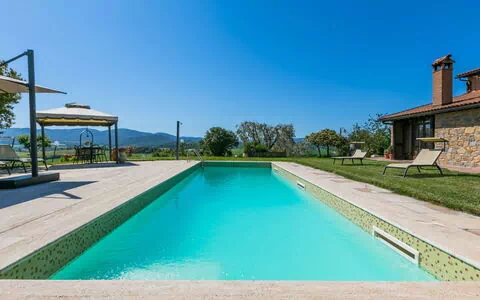 "Metallo" is a stunning semi-detached vacation rental located in the charming hamlet of Lano, just 10 kilometers from Colle Di Val D'elsa, Italy. Surrounded by picturesque trees, meadows, and fields, this property offers a tranquil and serene atmosphere. With a terraced garden spanning an impressive one hectare, it features a private swimming pool (10 x 3 meters, depth 140 - 180 cm) available for seasonal use from May 10th to October 5th. The pool area includes an outdoor shower, arbor, terrace, garden furniture, and barbecue. Additionally, the property has a yard, internet WiFi, and parking on the premises.