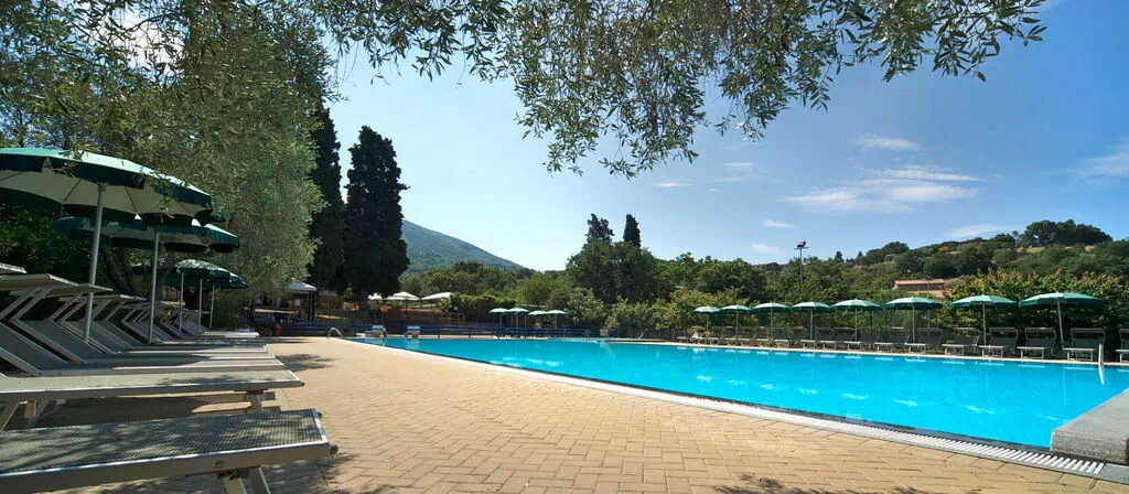 The outdoor spaces at Camping Village Il Fontino are thoughtfully designed to cater to guests of all ages. The main swimming pool, measuring 25 x 12 meters and open from May to September, is complemented by a dedicated children's pool, making it an ideal spot for families with younger guests. An outdoor shower is conveniently located in the pool area for guests' comfort. A playground is also situated on the property, providing children with a safe and enjoyable space for recreation. The surrounding grounds, set within a centenary olive grove, offer a naturally shaded and tranquil environment where guests can stroll, relax, and appreciate the unspoiled Tuscan countryside. The gently sloping hill on which the resort is positioned adds to the scenic character of the outdoor setting, creating a landscape that is both visually captivating and restful.