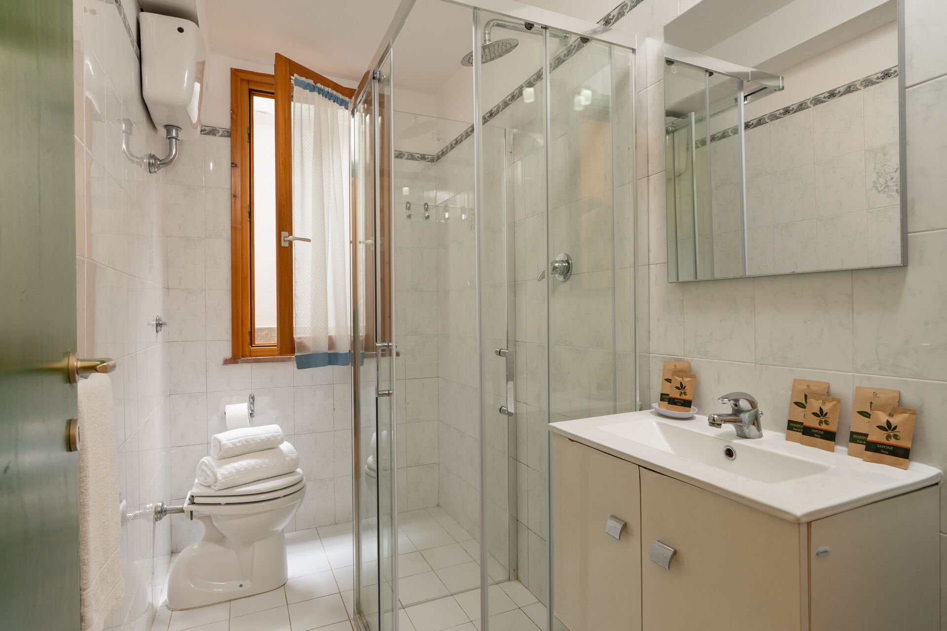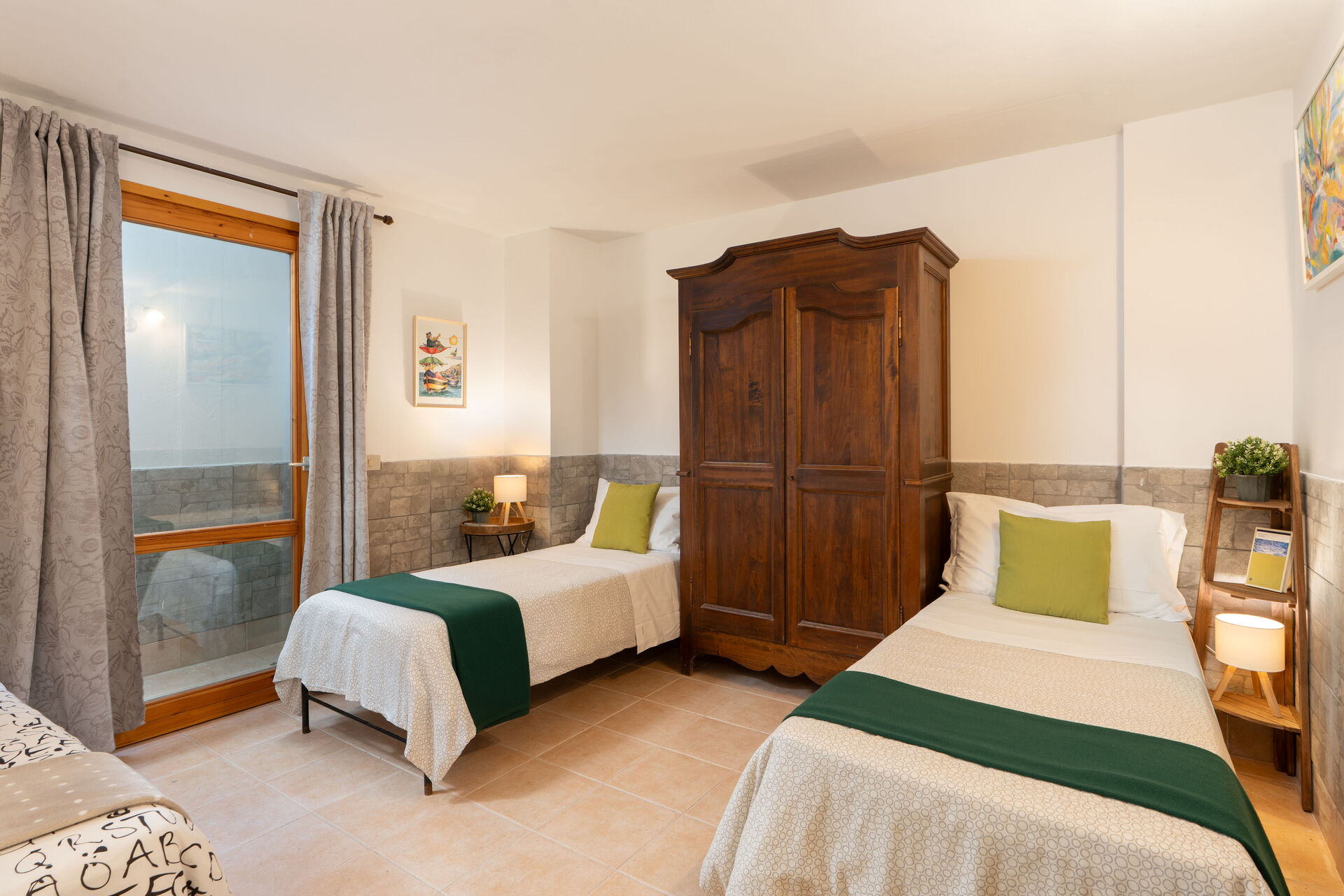 In the basement there is a bedroom with 3 single beds, window with mosquito net, fan, air conditioning/dehumidifier, a second bathroom with shower, sink, toilet, bidet and window