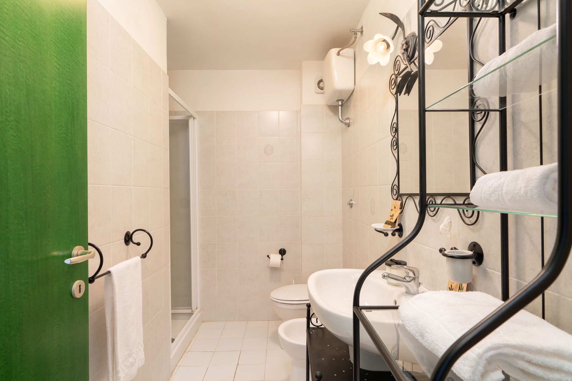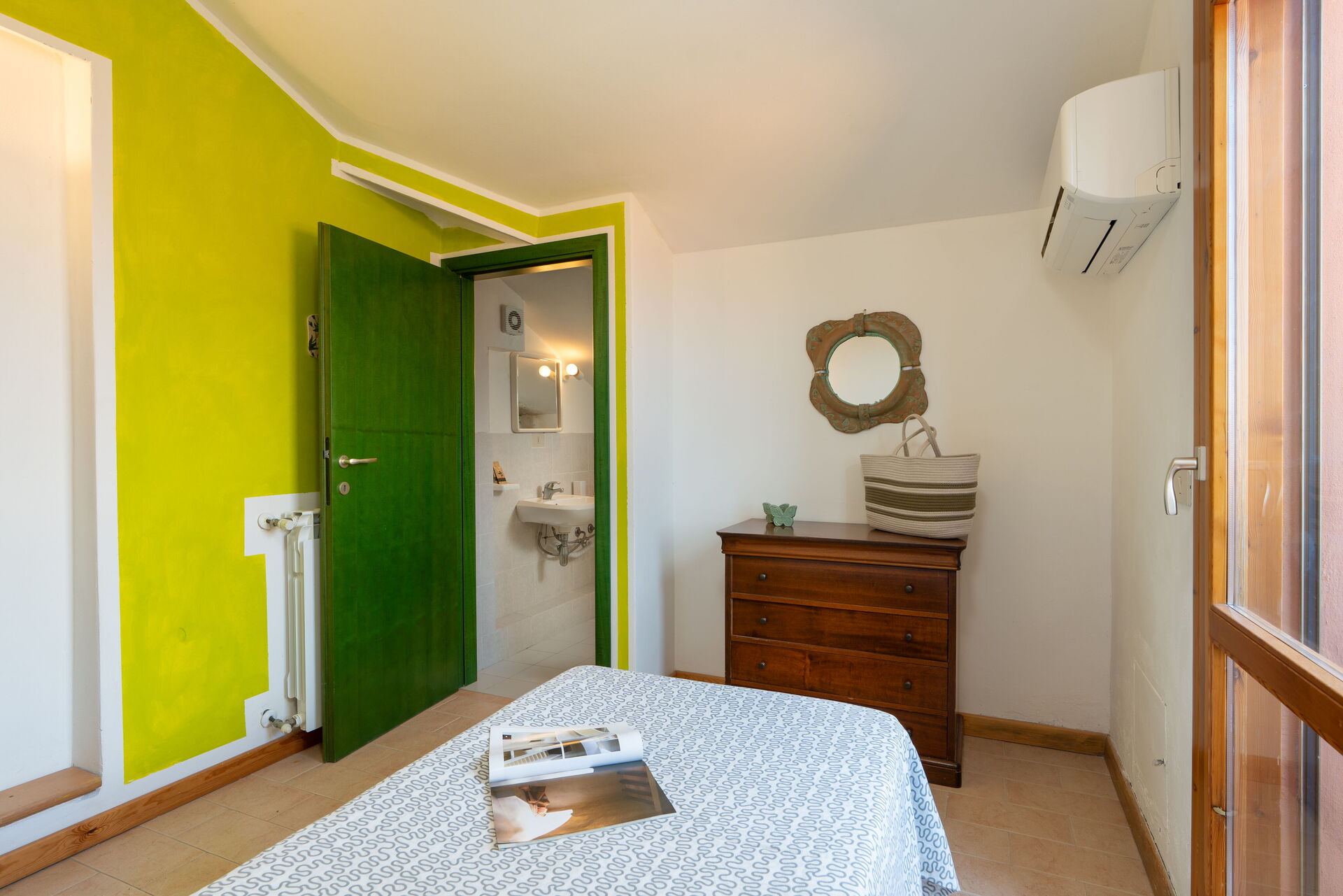 Upstairs there is an attic room with a single bed equipped with Air Conditioning, French door on the balcony and a bathroom with washbasin, WC and bidet.