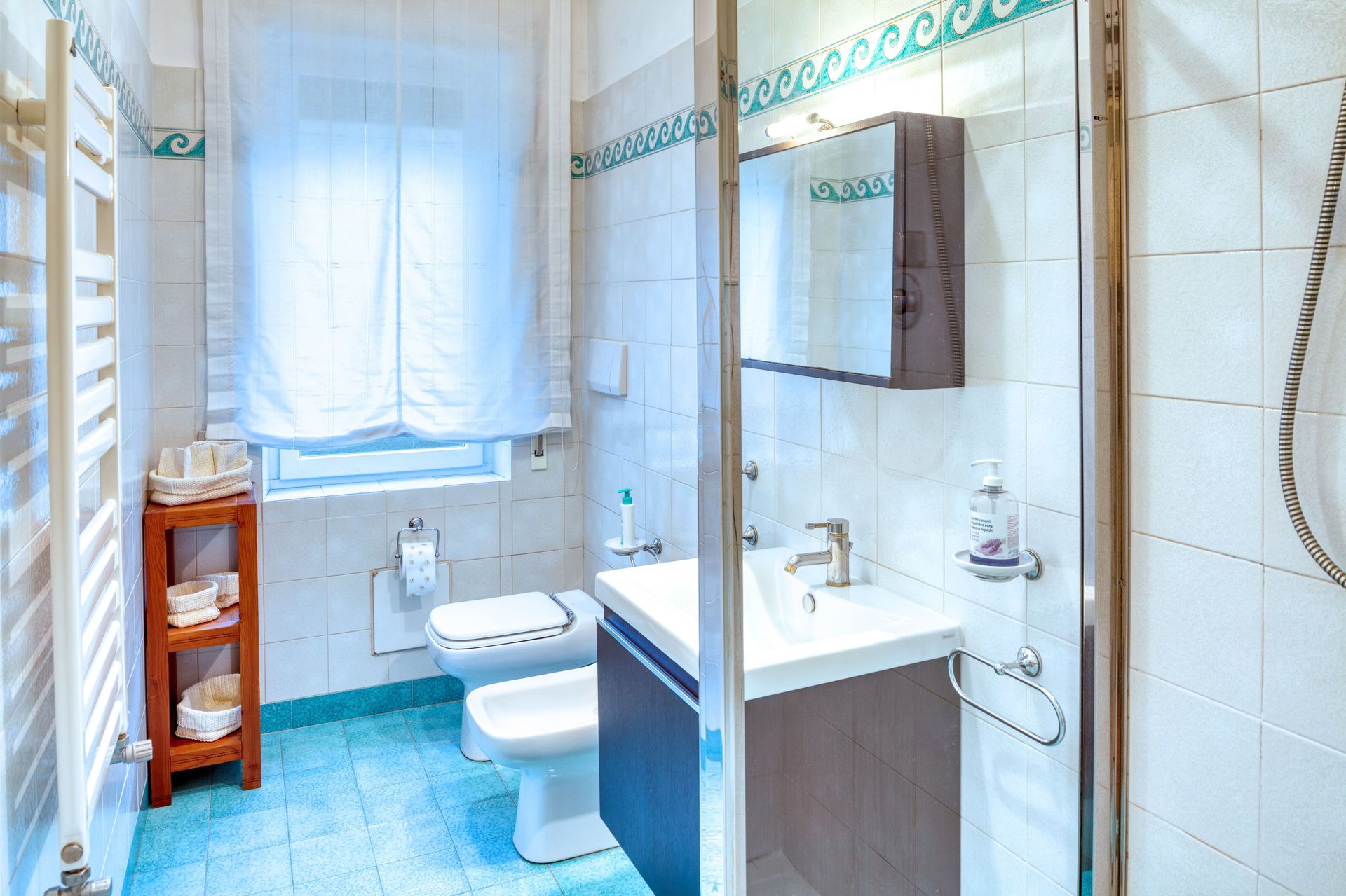 Bathroom with shower, sink, toilet and bidet. Washing machine.