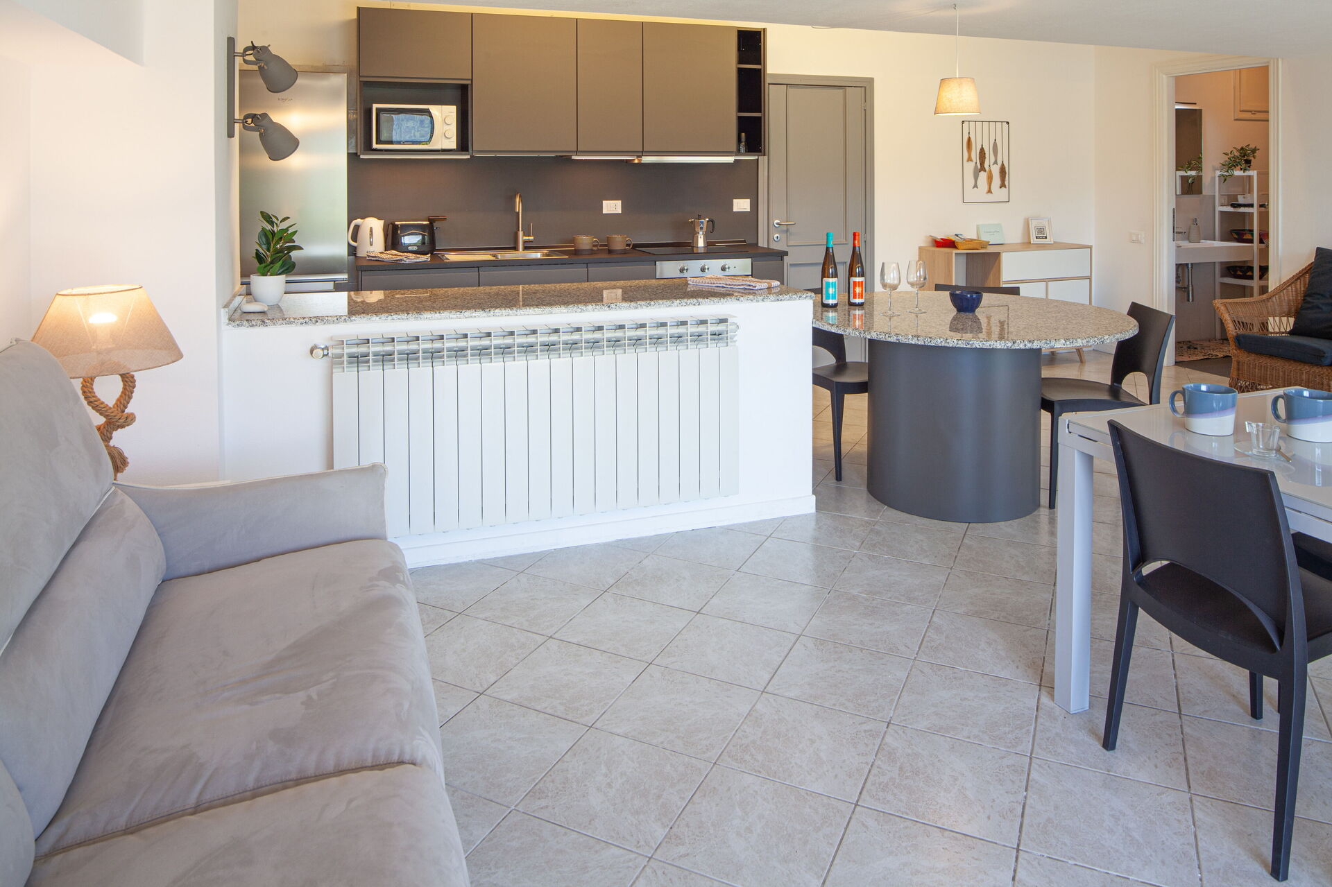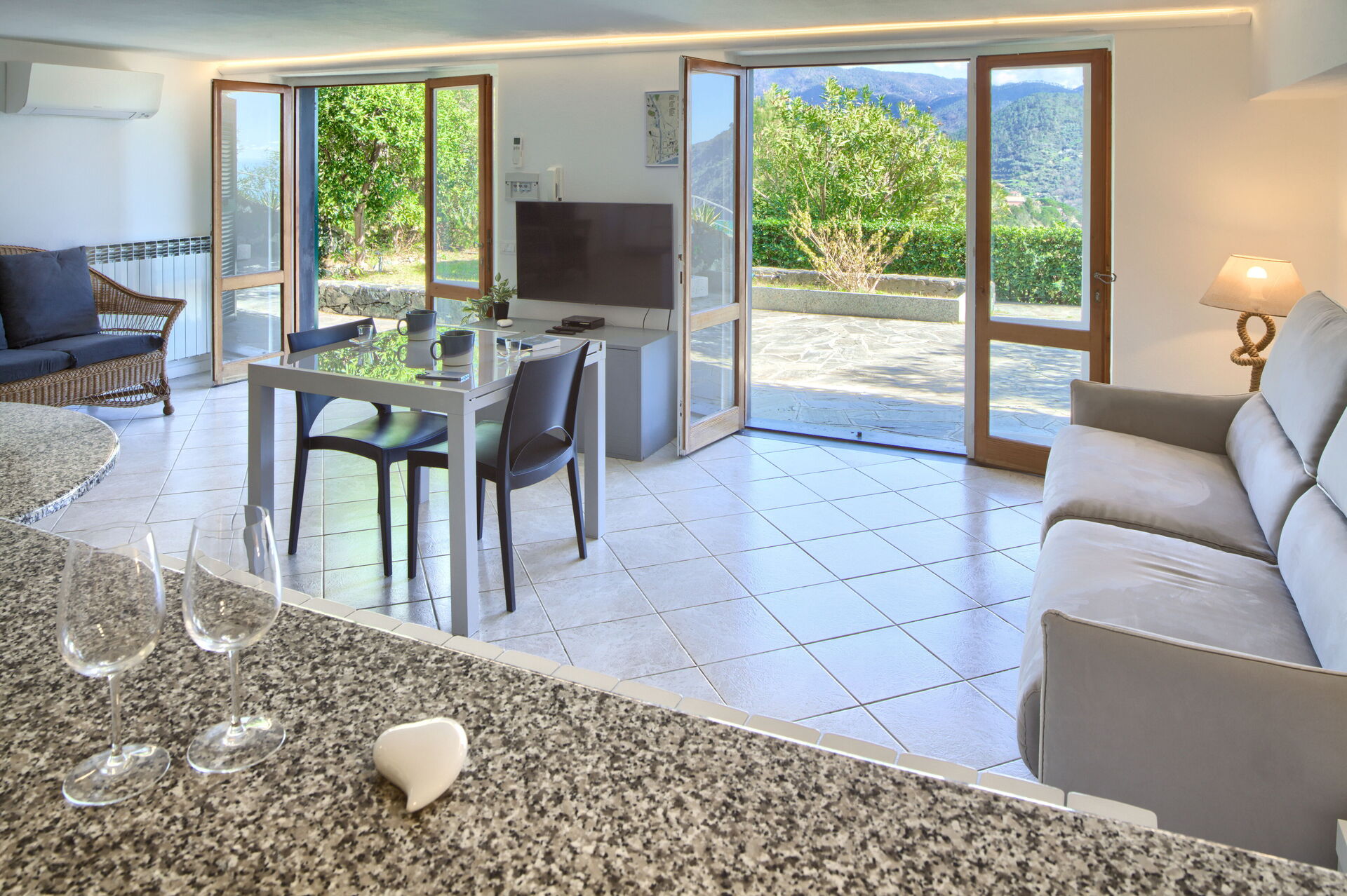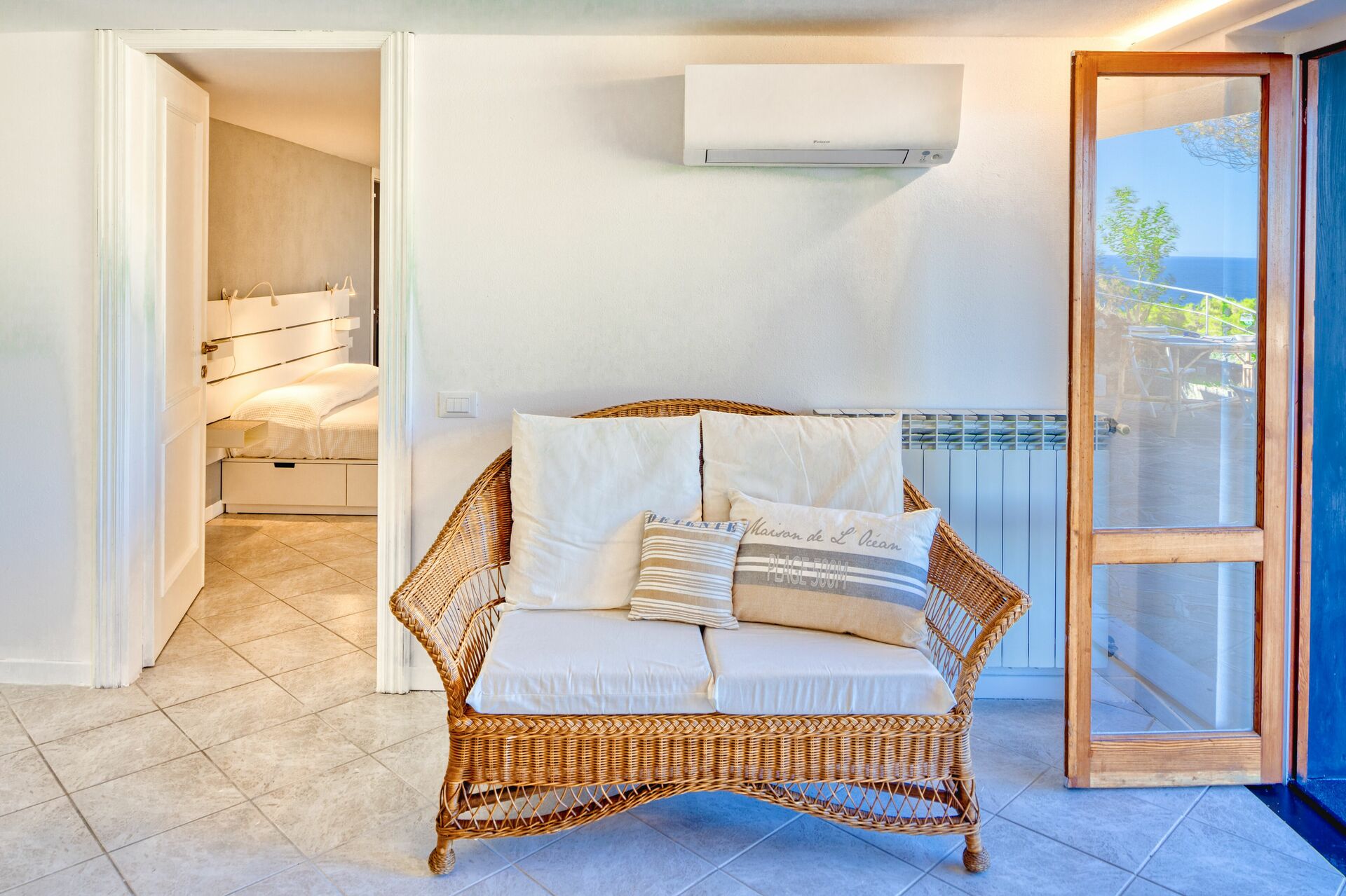 The external area has garden furniture, table with chairs and a little sofa, to enjoy breakfasts or dinners outdoors, with a breathtaking view of the sea.