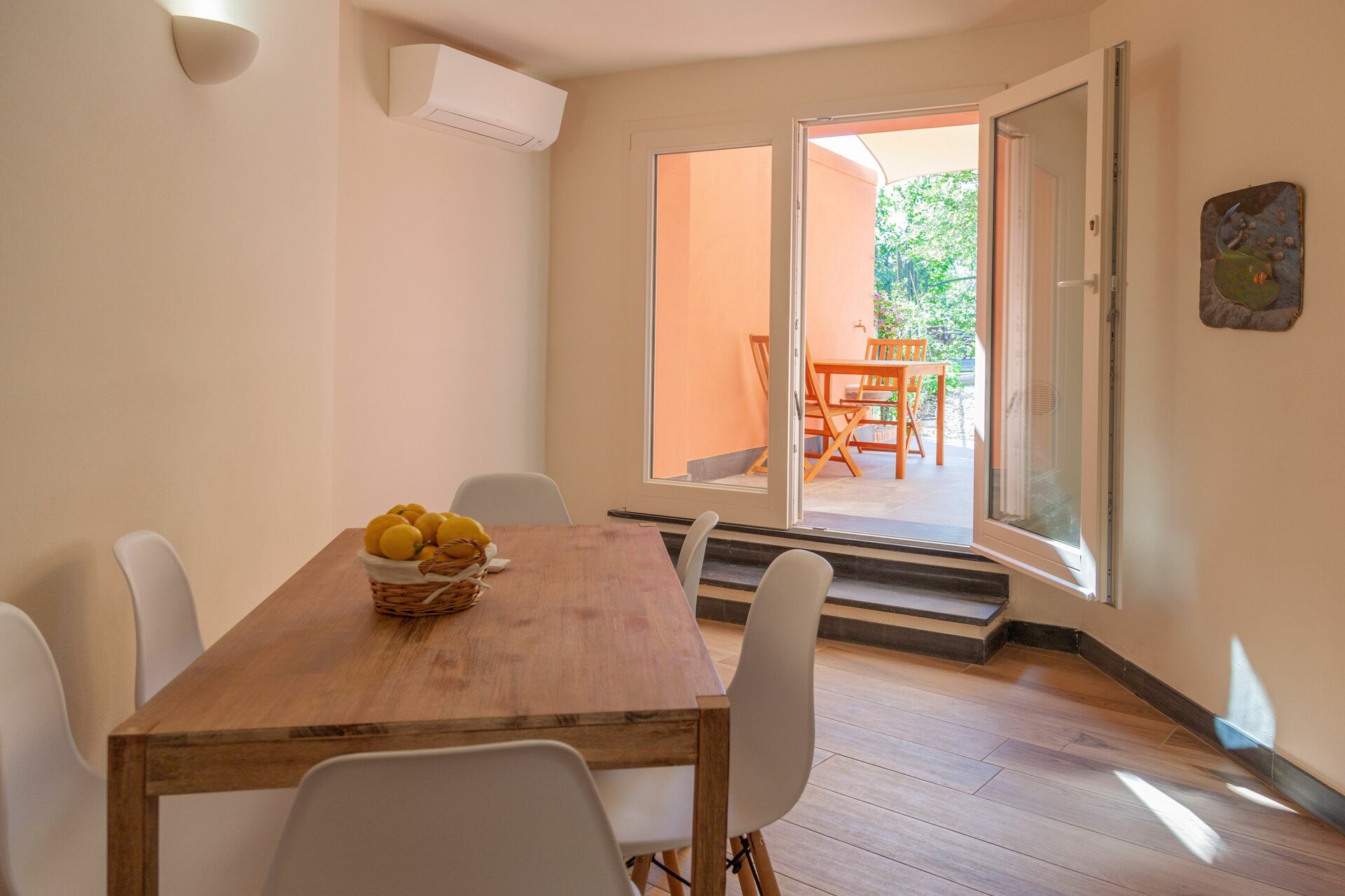 On the ground floor, with a small private garden, equipped with table, chairs and sunshade.