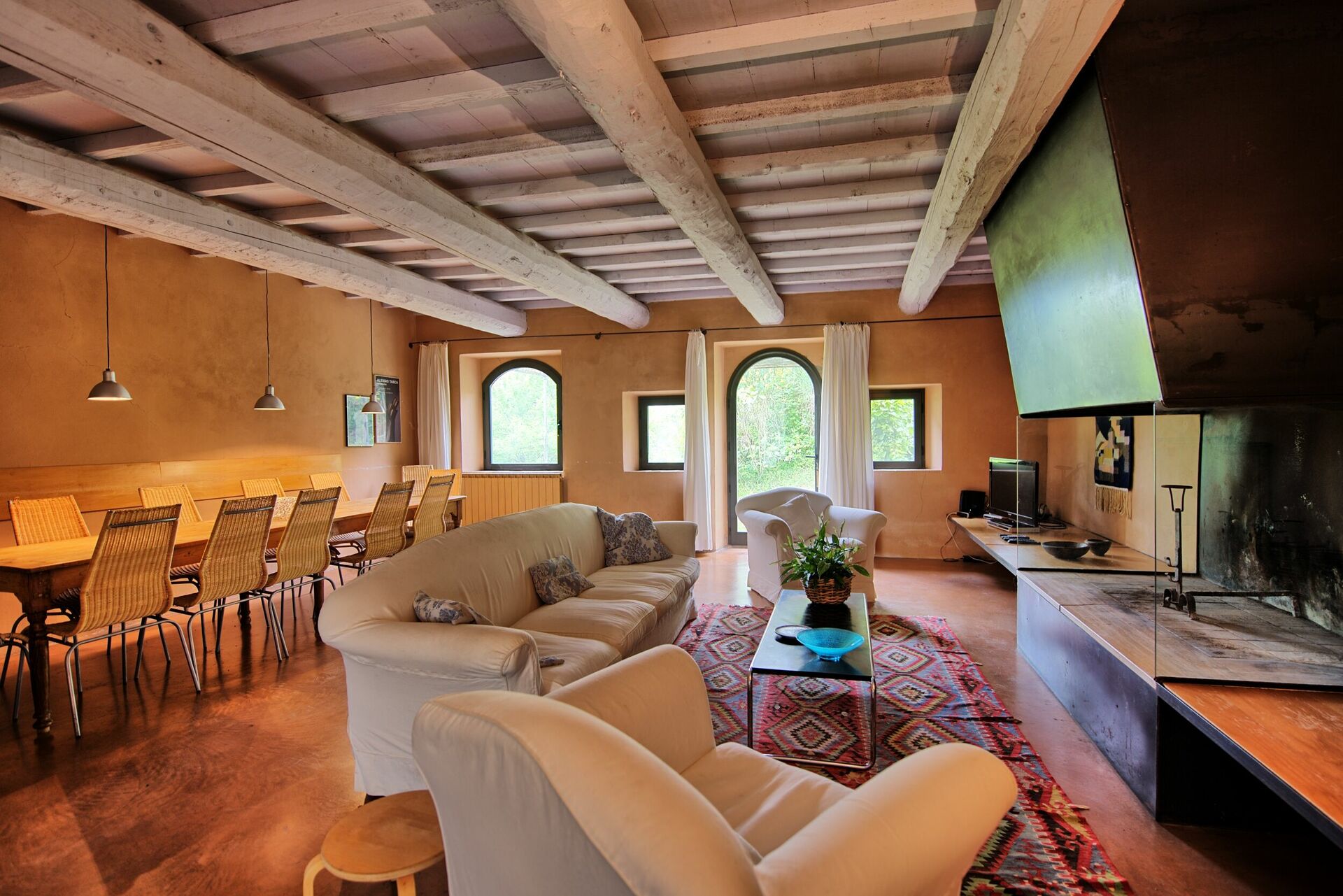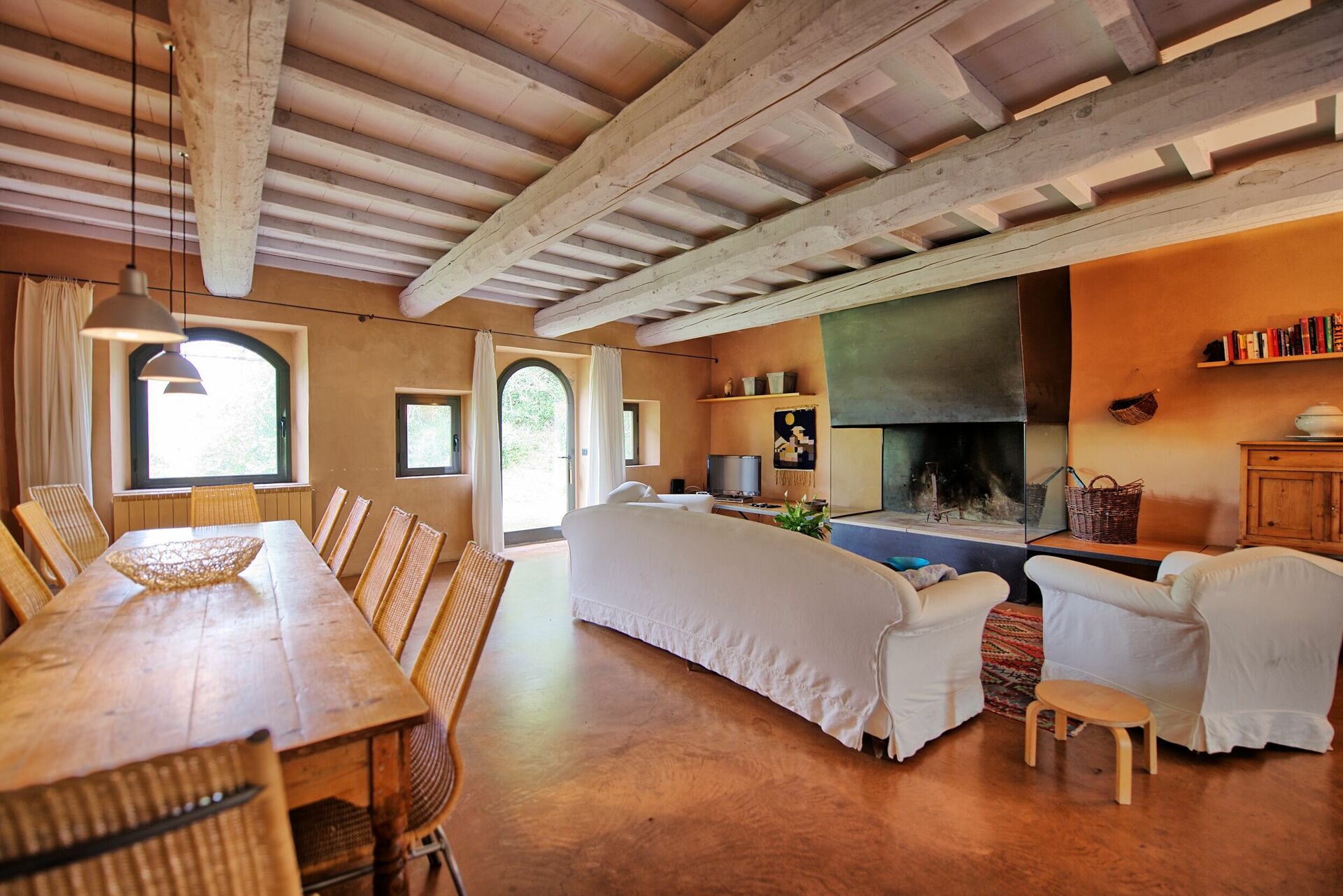 Ground Floor: entrance with large living room with a working fire place, sofas and arm chairs, dining table, TV satellite, dvd, wi-fi.