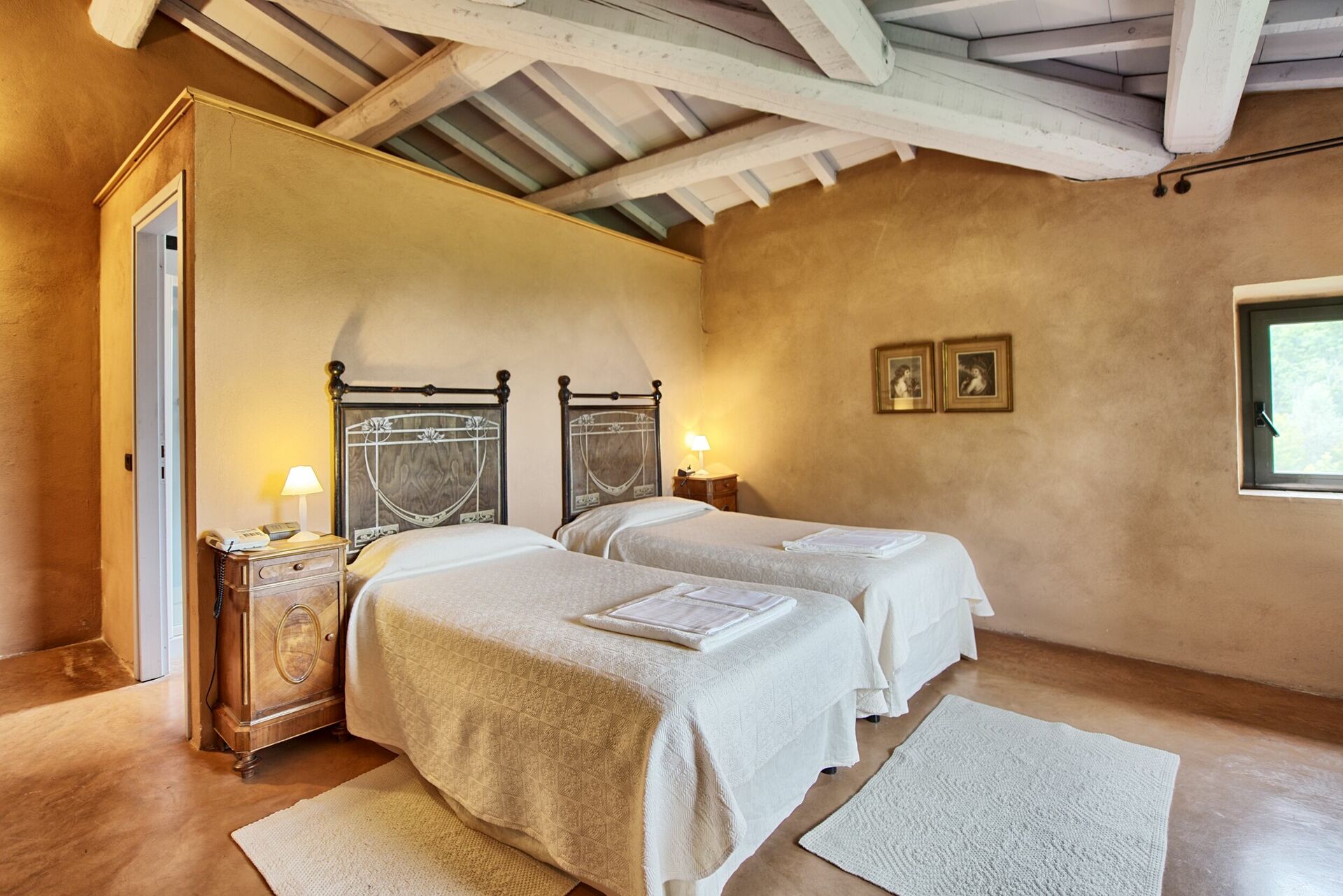 4 steps down: one bedroom with two single beds and private bathroom with shower.